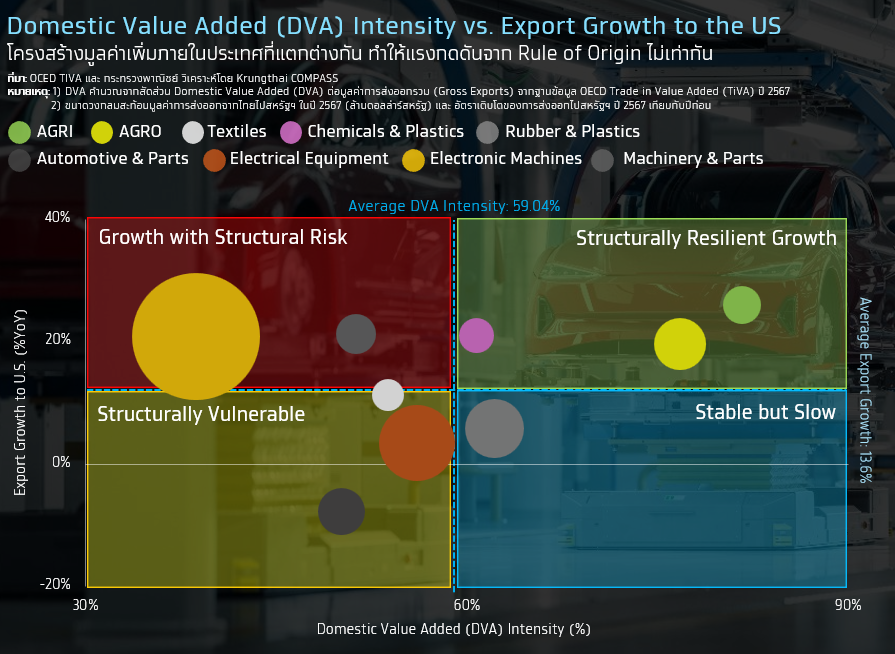 โครงสร้างมูลค่าเพิ่มภายในประเทศของไทยแตกต่างกันอย่างมีนัยระหว่างอุตสาหกรรม ทำให้ความเสี่ยงจากกฎถิ่นกำเนิดไม่ได้กระจายเท่ากัน เมื่อพิจารณา DVA ร่วมกับอัตราการเติบโตของการส่งออกไปสหรัฐฯ จะแบ่งอุตสาหกรรมได้เป็น 4 กลุ่มตามกราฟ