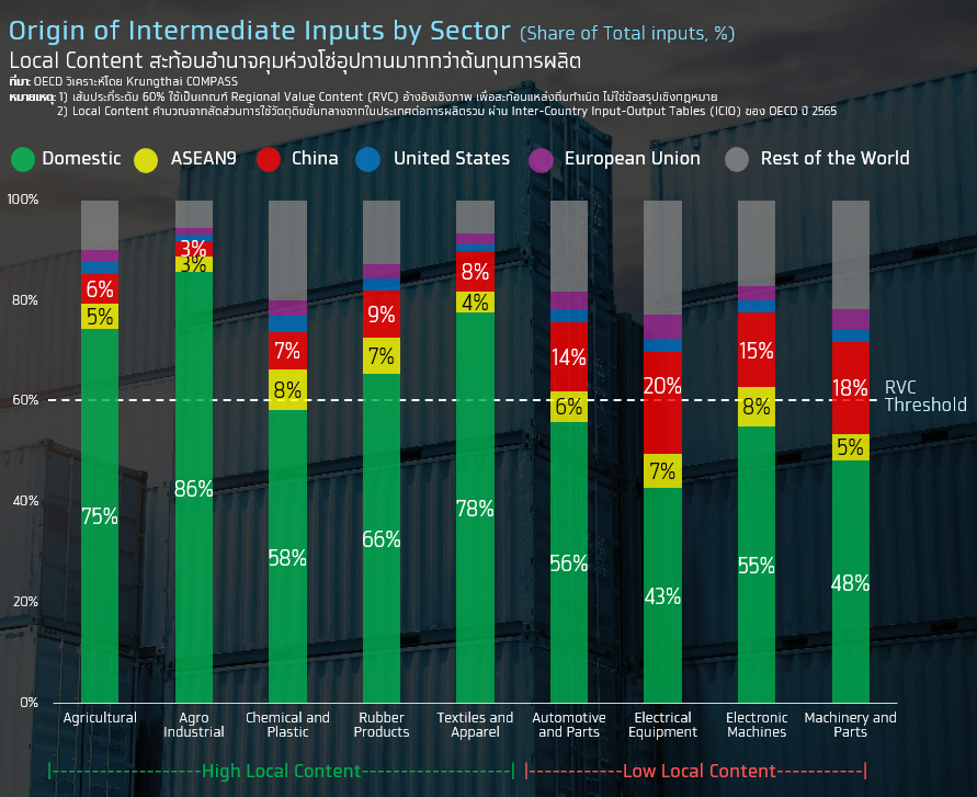 เมื่อพิจารณาแหล่งที่มาของวัตถุดิบ พบว่า อุปกรณ์ไฟฟ้า (49.8%) และเครื่องจักร (53.7%) มีสัดส่วน การพึ่งพาวัตถุดิบภายในประเทศและภูมิภาครวมต่ำกว่าเกณฑ์ 60% อย่างชัดเจน ขณะที่ยานยนต์ (62.1%) และอิเล็กทรอนิกส์ (63.0%) แม้ผ่านเกณฑ์เพียงเล็กน้อย แต่ยังพึ่งพาการนำเข้าจากนอกภูมิภาคในระดับสูง ทำให้ความเสี่ยงกระจุกตัว ในอุตสาหกรรมกลุ่ม Low Local Content