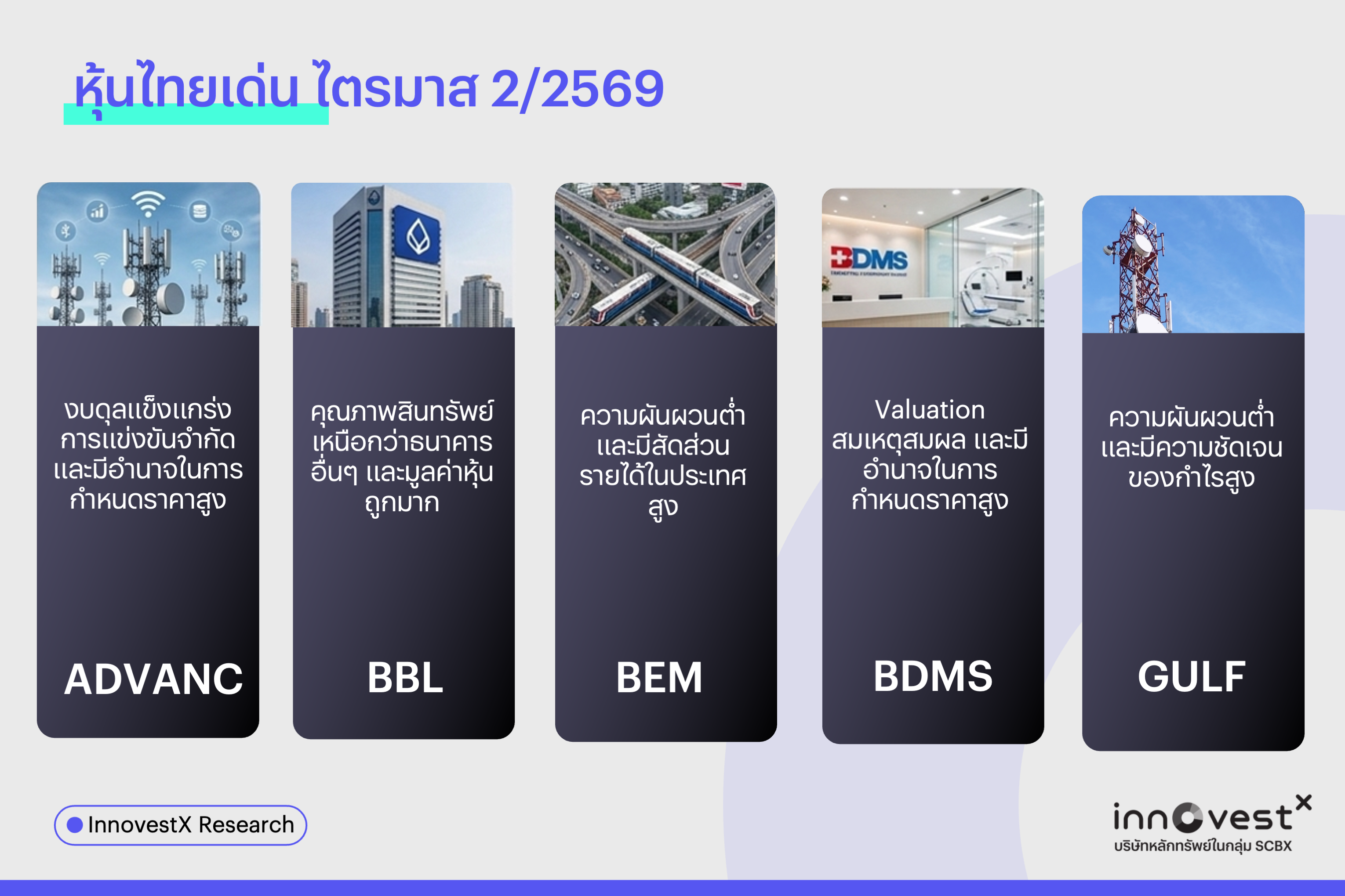 สำหรับตลาดหุ้นไทย ประเมินเป้าหมายของ SET Index ในปี 2569 ที่ระดับ 1,500–1,530 จุด โดยมีกลุ่ม ICT กลุ่มท่องเที่ยว และกลุ่มอิเล็กทรอนิกส์เป็นปัจจัยสนับสนุนหลัก โดยหุ้นที่แนะนำ ได้แก่ ADVANC, BBL, BDMS, BEM และ GULF ซึ่งเป็นบริษัทที่มีฐานะการเงินแข็งแกร่ง มีระดับมูลค่าที่เหมาะสมและมีแนวโน้มการเติบโตของกำไรในระยะต่อไป”