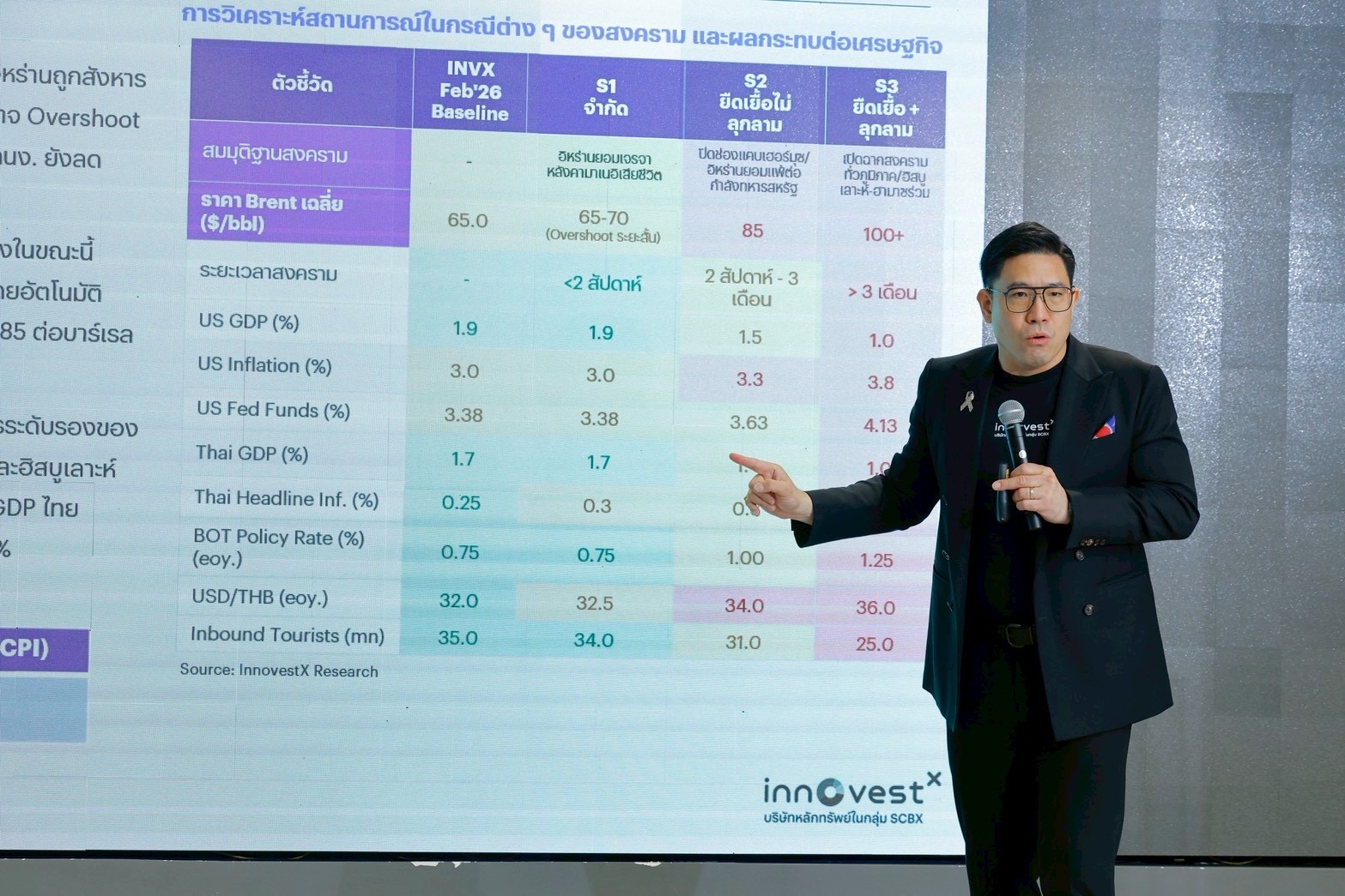 สำหรับไทย InnovestX ประเมิน GDP ในกรอบ 1.0–1.7% ขึ้นอยู่กับพัฒนาการของสงคราม โดยในสถานการณ์กลางที่มีความเป็นไปได้สูงที่สุดในขณะนี้ GDP จะขยายตัวชะลอลงเหลือ 1.4% กนง. ต้องคงดอกเบี้ยที่ 1.00% และบาทอ่อนค่าสู่ 34 บาท ขณะที่ไทยยังเผชิญความเปราะบางด้านพลังงานสูง โดยนำเข้าพลังงานสุทธิมากกว่า 7% ของ GDP และพึ่งพาน้ำมันดิบจากตะวันออกกลางถึง 57% ทุกๆ 10% ที่ราคาน้ำมันปรับขึ้น จะกด GDP ลง -0.04% และดันเงินเฟ้อขึ้น 0.35% (p.p.) ฉะนั้นหากดีเซลขยับจาก 30 บาทสู่ 40 บาท จะส่งผลกระทบต่อ GDP ถึง -0.13% และเงินเฟ้อสูงขึ้น 1.16% (p.p.) รวมถึงยังมีแรงกดดันเพิ่มเติมจากค่าระวางเรือที่เพิ่มขึ้นเกินสองเท่า วัตถุดิบปิโตรเคมีขาดแคลน และต้นทุน LNG ที่พุ่งสูงกว่า 100%”