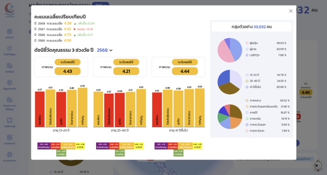 ศูนย์คุณธรรม (องค์การมหาชน) ภายใต้กระทรวงวัฒนธรรม เปิดเผยผลการสำรวจสถานการณ์คุณธรรมของคนไทย ประจำปี 2568 จากกลุ่มตัวอย่างจำนวน 33,032 คน อายุ 13 ปีขึ้นไป ครอบคลุมทุกภูมิภาคและอัตลักษณ์ทางเพศทั่วประเทศ พบภาพรวมคุณธรรมของสังคมไทยอยู่ในระดับ "พอใช้" ขณะที่มิติสำคัญอย่าง “ความพอเพียง” และ “ความสุจริต” มีแนวโน้มลดลงจนอยู่ในระดับที่น่าเป็นห่วง