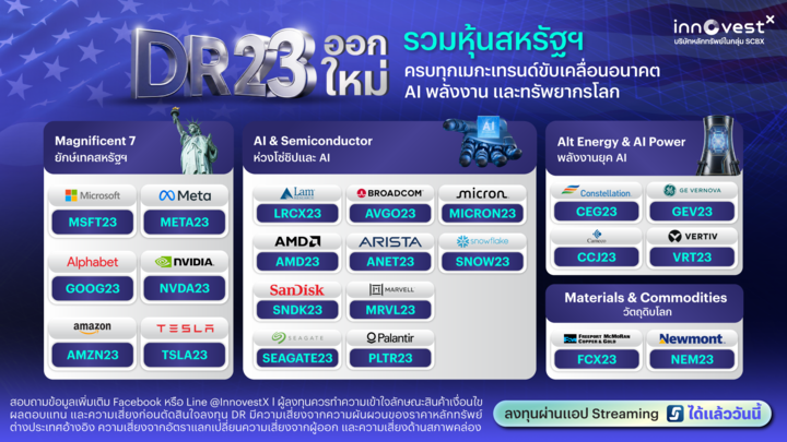 InnovestX รุกตลาด DR ต่อเนื่อง ส่ง DR23 ชุดใหม่ เสริมพอร์ตหุ้นสหรัฐฯ ผู้นำเทคโนโลยีโลก ต่อยอดโอกาสจาก AI และเศรษฐกิจดิจิทัล