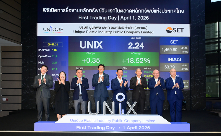 อัสสเดช คงสิริ กรรมการและผู้จัดการ สรวิศ ไกรฤกษ์ รองผู้จัดการ หัวหน้าสายงานการตลาด ตลาดหลักทรัพย์แห่งประเทศไทย พร้อมด้วย โสฬส ยอดมงคล ประธานเจ้าหน้าที่บริหาร บมจ. ยูนิคพลาสติก อินดัสตรี (UNIX) ร่วมพิธีเปิดการซื้อขายวันแรกในตลาดหลักทรัพย์ฯ ในวันที่ 1 เมษายน 2569 ด้วยมูลค่าหลักทรัพย์ ณ ราคา IPO 1,247.40 ล้านบาท โดย UNIX เป็นผู้ผลิตและจำหน่ายฟิล์มและบรรจุภัณฑ์พลาสติกครบวงจรด้วยนวัตกรรมสีเขียว