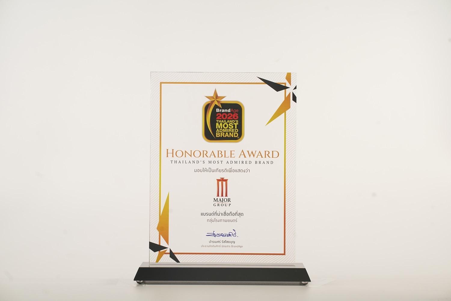 บริษัท เมเจอร์ ซีนีเพล็กซ์ กรุ้ป จำกัด (มหาชน) ตอกย้ำความเป็นผู้นำอุตสาหกรรมธุรกิจโรงภาพยนตร์ของประเทศไทย คว้ารางวัลอันดับ 1 ในใจผู้บริโภคจากผลสำรวจ "2026 Thailand's Most Admired Brand" ในกลุ่มโรงภาพยนตร์ต่อเนื่องเป็นปีที่ 5 สะท้อนความแข็งแกร่งของแบรนด์ที่ปรับตัวเข้ากับยุคสมัย และการสร้างประสบการณ์ความบันเทิงที่เหนือระดับอย่างไม่หยุดนิ่ง