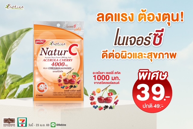 บริษัท บีไชน์ นูทริชั่น พลัส จำกัด มอบความคุ้มค่าต้อนรับฤดูกาลซัมเมอร์ จัดโปรโมชั่นสุดพิเศษ สำหรับ "บีไชน์ เนเจอร์ซี (B Shine Nature C) สูตรใหม่" วิตามินซีจากธรรมชาติ 100% ช่วยดูแลผิวพรรณให้แลดูสดใสและระบบภูมิคุ้มกันให้แข็งแรง แค่วันละเม็ด ขนาดซองพกพา (บรรจุ 5 เม็ด แถมฟรี 1 เม็ด ทันทีในซอง) ลดราคาพิเศษเหลือเพียง 39 บาท (จากราคาปกติ 49 บาท) และสิทธิพิเศษเฉพาะสมาชิก All Member ลดเพิ่มอีก 1 บาท เหลือเพียง 38 บาท เท่านั้น หาซื้อได้ตั้งแต่วันนี้ – 23 เมษายน 2569 ที่ร้านเซเว่น อีเลฟเว่น (7-Eleven) ทุกสาขาทั่วประเทศ