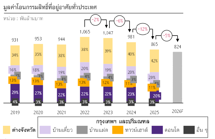 การโอนกรรมสิทธิ์ที่อยู่อาศัยปี 2569 มีแนวโน้มหดตัวต่อเนื่องเป็นปีที่ 4 โดย SCB EIC คาดว่ามูลค่าการโอนทั่วประเทศในปี 2569 จะหดตัว -5%YOY มาอยู่ที่ 824,000 ล้านบาท จากภาระหนี้สิน ค่าใช้จ่ายที่เพิ่มขึ้นเร็วกว่ารายได้ และการให้สินเชื่อของสถาบันการเงินที่เข้มงวดต่อเนื่องจากปี 2568 อีกทั้ง สงครามตะวันออกกลางมีแนวโน้มซ้ำเติมกำลังซื้อให้ฟื้นตัวได้ยากมากขึ้น โดยกรณีสงครามยืดเยื้อ มีความเสี่ยงหดตัว -10% ถึง -15%YOY