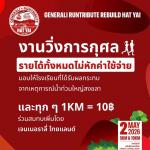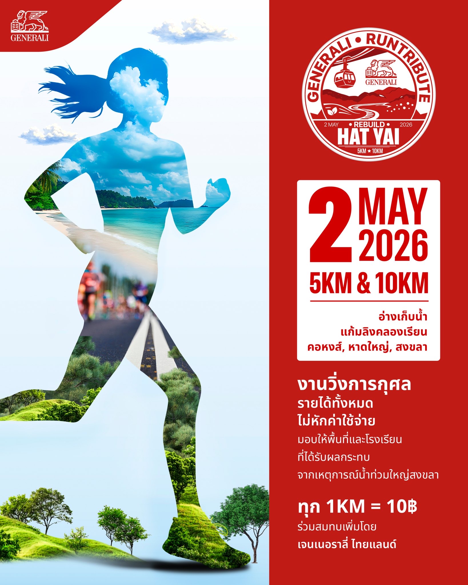 สำหรับกิจกรรม “GENERALI RUNTRIBUTE: REBUILD HAT YAI” จัดขึ้นในวันที่ 2 พฤษภาคม 2569 ตั้งแต่เวลา 14.00 - 20.00 น. ณ อ่างเก็บน้ำคอหงส์ (แก้มลิงคลองเรียน) เทศบาลเมืองคอหงส์ อำเภอหาดใหญ่ จังหวัดสงขลา โดยแบ่งรูปแบบการวิ่งออกเป็น Mini Marathon ระยะทาง 10 กิโลเมตร และ Fun Run ระยะทาง 5 กิโลเมตร ค่าสมัครเพียง 500 บาท ทุกระยะทาง พร้อมร่วมวิ่งไปกับ “วีเจจ๋า” ณัฐฐาวีรนุช ทองมี ที่จะมาร่วมสร้างสีสันและแรงบันดาลใจตลอดเส้นทาง
