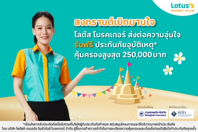 โลตัส โบรคเกอร์ สานพันธกิจ "พลัสความสุข ทุกความคุ้มค่า" ส่งต่อความอุ่นใจช่วงสงกรานต์ มอบกรมธรรม์ประกันอุบัติเหตุฟรี จำนวน 10,000 กรมธรรม์ให้กับประชาชนทั่วไป ตั้งแต่ 1 เมษายน 2569 - 31 พฤษภาคม 2569 (หรือจนกว่าสิทธิ์จะเต็ม) ด้วยความคุ้มครองอุบัติเหตุสูงสุด 250,000 บาท พร้อมค่ารักษาพยาบาลสูงสุด 5,000 บาท นาน 30 วัน โดยลงทะเบียนรับสิทธิ์ได้ที่เคาน์เตอร์โลตัส มันนี่ พลัส?กว่า 200 สาขาทั่วประเทศ เพื่อส่งเสริมให้ประชาชนมีหลักประกันความคุ้มครองอุบัติเหตุและการเข้าถึงประกันภัย รวมถึงสนับสนุนนโยบายการสร้างการรับรู้ด้านประกันภัยของสำนักงานคณะกรรมการกำกับและส่งเสริมการประกอบธุรกิจประกันภัย (คปภ.) กรมธรรม์ดังกล่าวให้บริการนายหน้าประกันภัยโดย บริษัท โลตัสส์ เจเนอรัล อินชัวรันส์ โบรคเกอร์ จำกัด และรับประกันภัยโดย บริษัท กรุงเทพประกันภัย จำกัด (มหาชน) ทั้งนี้ รายละเอียดความคุ้มครองและเงื่อนไขเป็นไปตามที่ระบุไว้ในกรมธรรม์ ข้อมูลเพิ่มเติม