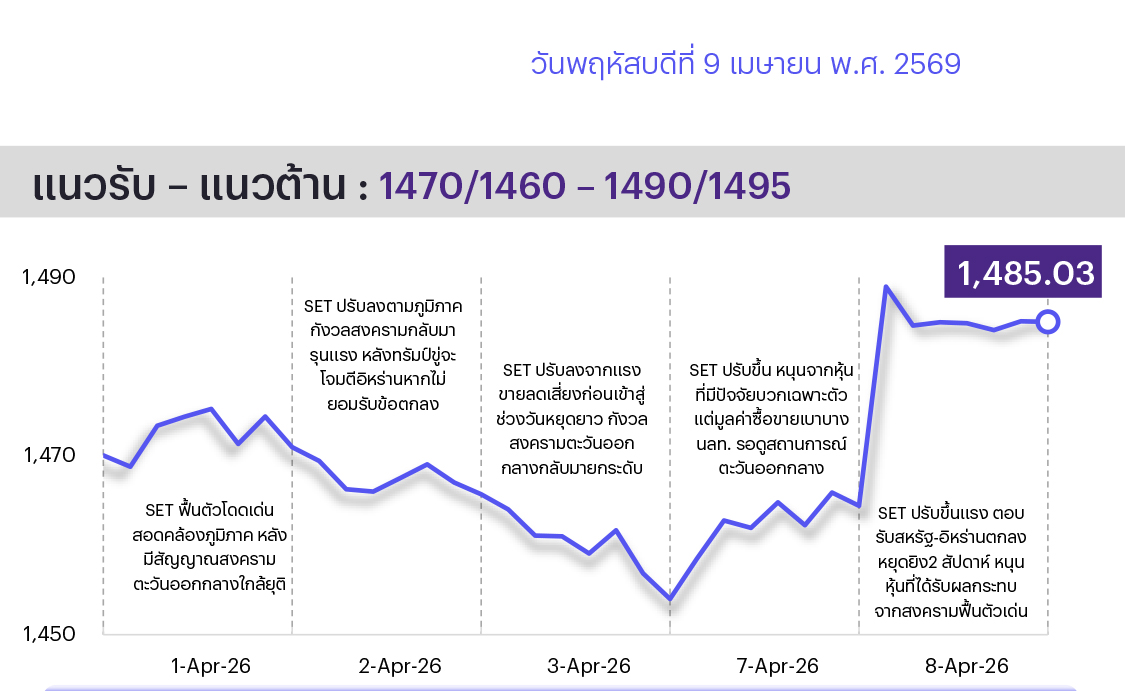 คาด SET แกว่งผันผวน สถานการณ์ตะวันออกกลางยังไม่แน่นอน อิหร่านระบุสหรัฐฯ เป็นฝ่ายละเมิดเงื่อนไขพร้อมขู่ถอนตัวจากข้อตกลงหยุดยิงและสั่งห้ามเรือผ่านช่องแคบฮอร์มุซหลังอิสราเอลยังคงโจมตีเลบานอน ขณะที่สหรัฐฯ ระบุแผนสันติภาพ 10 ข้อของอิหร่านแตกต่างจากแผนที่ ปธน.ทรัมป์ได้รับ ส่งผลเชิงลบต่อ sentiment ลงทุนช่วงสั้น ประเด็นติดตามวันนี้ การแถลงนโยบายรัฐบาลต่อรัฐสภาวันแรก (9-10 เม.ย.) ทางเทคนิคประเมินแนวต้าน 1490-1495 แนวรับ 1470-1460
