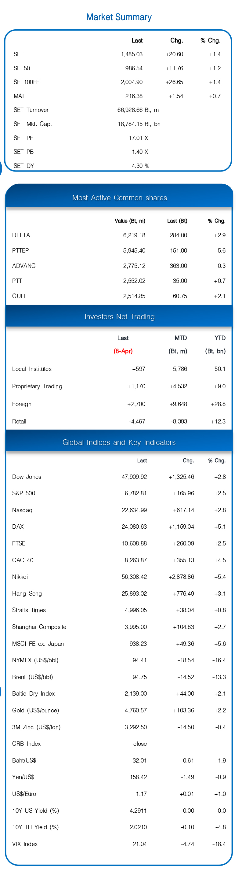 หยุดยิง 2 สัปดาห์ – SET เปิดกระโดดขึ้นผ่านระดับ 1480 และแกว่งแดนบวกทั้งวันในกรอบ 1479-91 อานิสงส์สหรัฐฯ-อิหร่านตกลงหยุดยิง 2 สัปดาห์ตามข้อเสนอของปากีสถาน และอิหร่านยอมเปิดช่องแคบฮอร์มุซ ช่วยผ่อนคลายความกังวลสงครามต่างชาติซื้อสุทธิ 2.7 พันลบ. 2 วันติด แต่พลิก Short S50 Futures 7,281 สัญญา