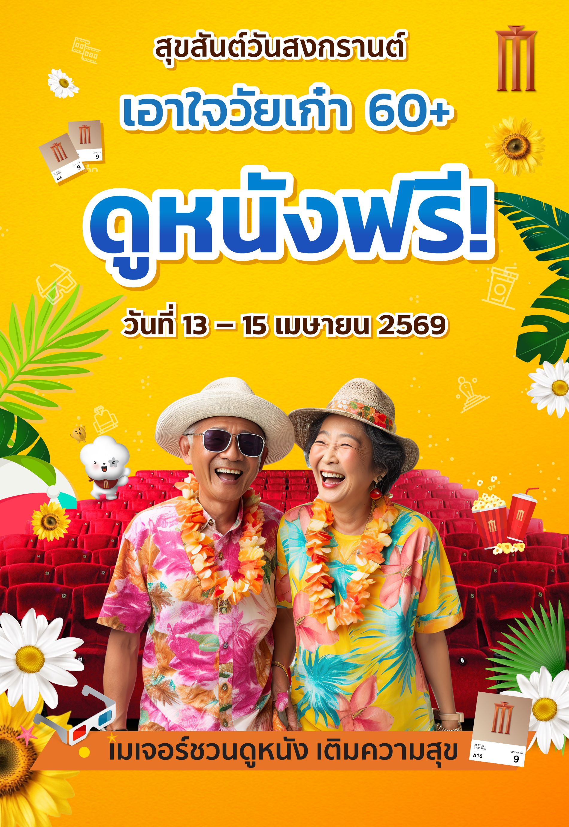 เมเจอร์ ซีนีเพล็กซ์ กรุ้ป ตอกย้ำความเป็นผู้นำด้านความบันเทิงที่ตอบโจทย์ทุกเจเนอเรชั่น เดินหน้าสร้างโมเมนต์แห่งความสุขให้ครอบครัวไทยในช่วงเทศกาลสงกรานต์และวันผู้สูงอายุแห่งชาติประจำปี 2569 ผ่านกิจกรรม "สุขสันต์วันสงกรานต์ เอาใจวัยเก๋า 60+ ดูหนังฟรี" มอบสิทธิ์รับชมภาพยนตร์ฟรี รวม 30,000 ที่นั่ง ที่โรงภาพยนตร์ในเครือเมเจอร์ ซีนีเพล็กซ์ ทุกสาขาทั่วประเทศ เพื่อสร้างรอยยิ้มและประสบการณ์สุดพิเศษให้กับผู้สูงอายุ ตั้งแต่วันที่ 13-15 เมษายนนี้