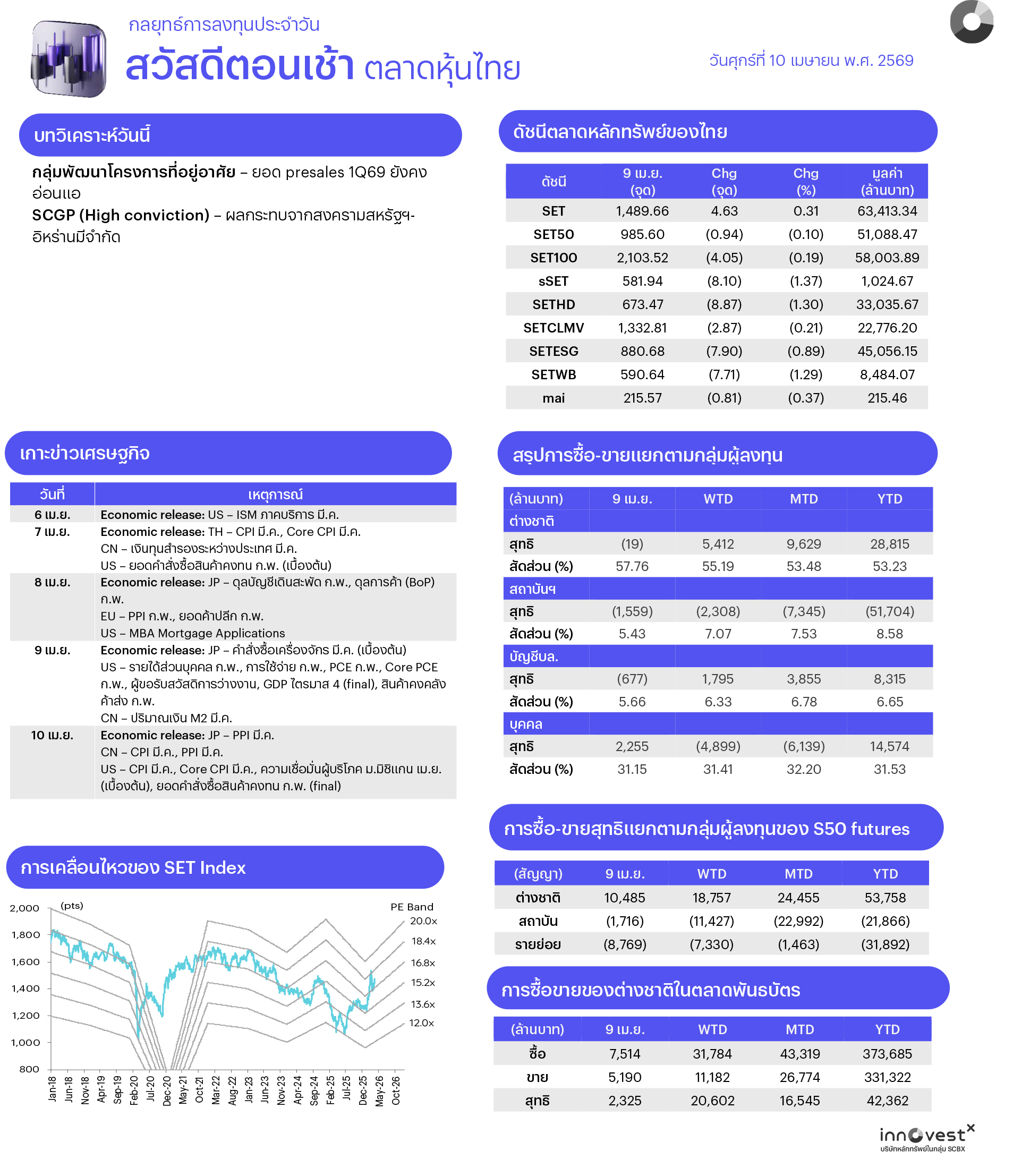 คาด SET แกว่งขึ้น จากข่าวอิสราเอลและเลบานอนเตรียมเจรจาสันติภาพสัปดาห์หน้า สร้างความหวังเชิงบวกต่อการเจรจาสหรัฐฯ-อิหร่านที่ปากีสถานเช้าวันพรุ่งนี้ (ตามเวลาท้องถิ่น) ขณะที่ราคาน้ำมันย่อตัว Bond Yield ชะลอลง หนุนสินทรัพย์เสี่ยงช่วงสั้น อย่างไรก็ตาม ดัชนีอาจย่อตัวช่วงท้ายจากแรงขายลดความเสี่ยงก่อนหยุดยาว ประเด็นวันนี้ การแถลงนโยบายรัฐบาลวันสุดท้าย จากนั้นพรุ่งนี้ ประชุม ครม. นัดแรก ทางเทคนิคประเมินแนวต้าน 1500-1510 แนวรับ 1475-1465