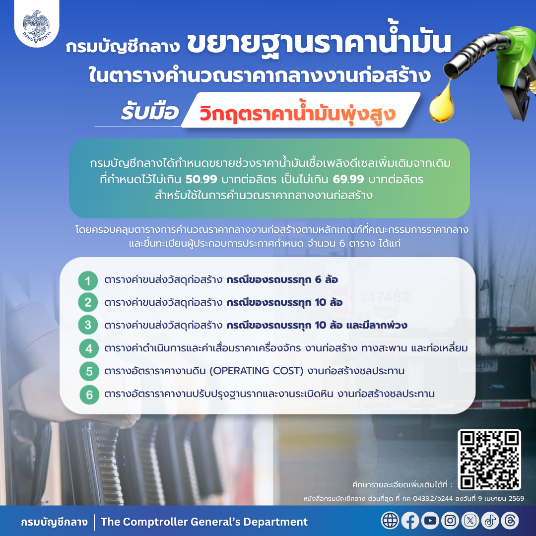 ราคาน้ำมันดังกล่าว มีวัตถุประสงค์เพื่อให้หน่วยงานของรัฐสามารถนำไปใช้ในการคำนวณราคากลางงานก่อสร้างได้อย่างเหมาะสม สอดคล้องกับต้นทุนจริง” อธิบดีกรมบัญชีกลางกล่าวทิ้งท้าย