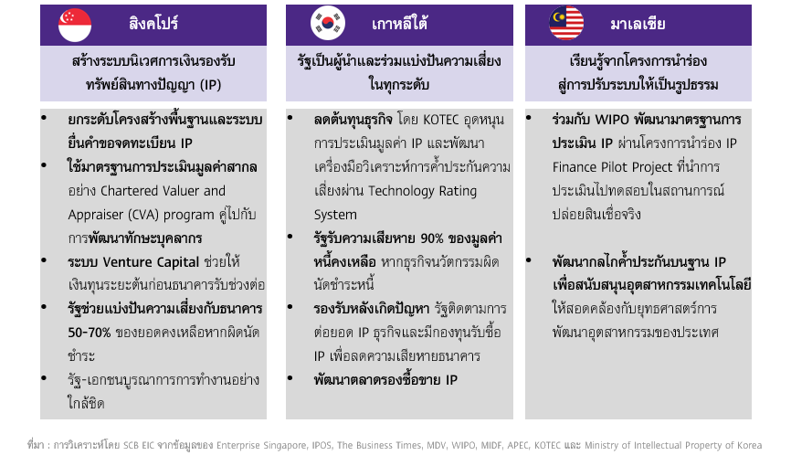 จุดเด่นสำคัญของเกาหลีใต้ คือการติดตามผลหลังการปล่อยสินเชื่ออย่างต่อเนื่องโดย Korean Intellectual Property Office (KIPO) และการพัฒนาตลาดรองสำหรับ IP ในกรณีที่ธุรกิจผิดนัดชำระหนี้ กองทุนรับซื้อ IP ที่ได้รับการสนับสนุนจากกระทรวงการคลังสามารถเข้าซื้อ IP เพื่อนำเงินมาชดเชยความเสียหายให้ธนาคารได้ กรณีศึกษานี้สะท้อนว่า การที่รัฐพร้อมรับความเสี่ยงเป็นลำดับแรกในทุกขั้นตอน ช่วยสร้างความเชื่อมั่นให้ภาคการเงินในการสนับสนุนธุรกิจนวัตกรรมที่มีความเสี่ยงสูง