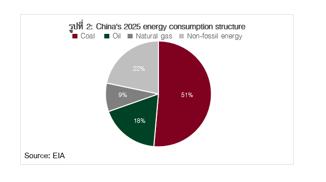 อย่างไรก็ดี จีนมีการกระจายความเสี่ยงทั้งในแหล่งนำเข้าน้ำมัน และช่องทางการนำเข้าน้ำมัน รวมถึงมีน้ำมันสำรองอยู่ในระดับสูงราว 110-140 วัน นอกจากนี้ โครงสร้างพลังงานของจีนยังพึ่งพาถ่านหินเป็นสำคัญกว่า 50% (รูปที่ 2) ดังนั้น ผลกระทบต่อเศรษฐกิจจีนระยะสั้นคาดมีจำกัด