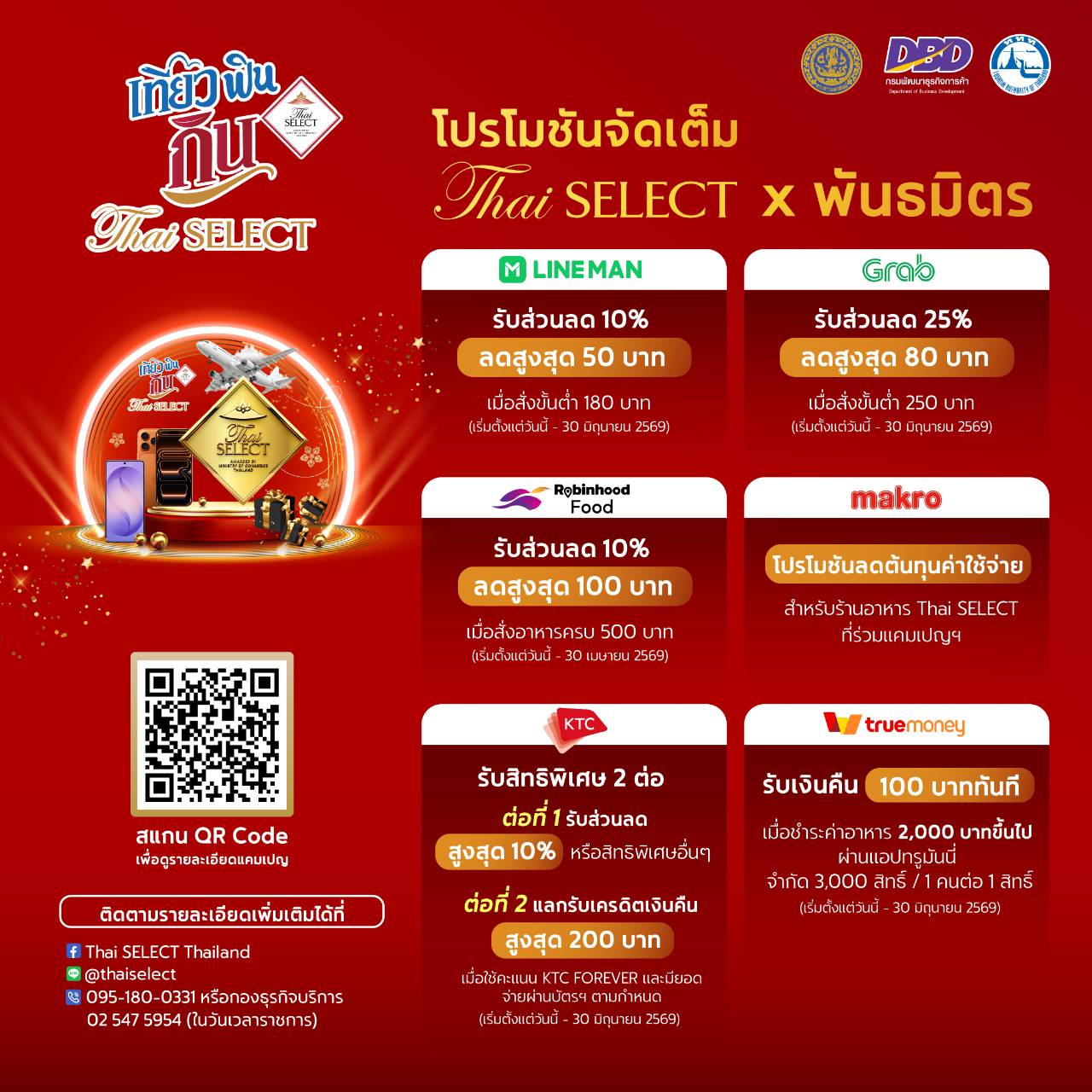 ดูรายละเอียดแคมเปญ “เที่ยว ฟิน กิน Thai SELECT ปี 3” หรือ ค้นหาร้านอาหาร Thai SELECT ทั่วประเทศ พร้อมรับสิทธิประโยชน์อีกมากมายผ่าน Facebook: Thai SELECT Thailand, Line OA: @thaiselect และเว็บไซต์ www.thaiselectth.com หรือสอบถามข้อมูลเพิ่มเติมได้ที่ กองธุรกิจบริการ กรมพัฒนาธุรกิจการค้า กระทรวงพาณิชย์ โทรศัพท์ 0 2547 5954 เว็บไซต์กรมพัฒนาธุรกิจการค้า www.dbd.go.th หรือ Call Center 1570 ” อธิบดีพูนพงษ์ฯ กล่าวทิ้งท้าย
