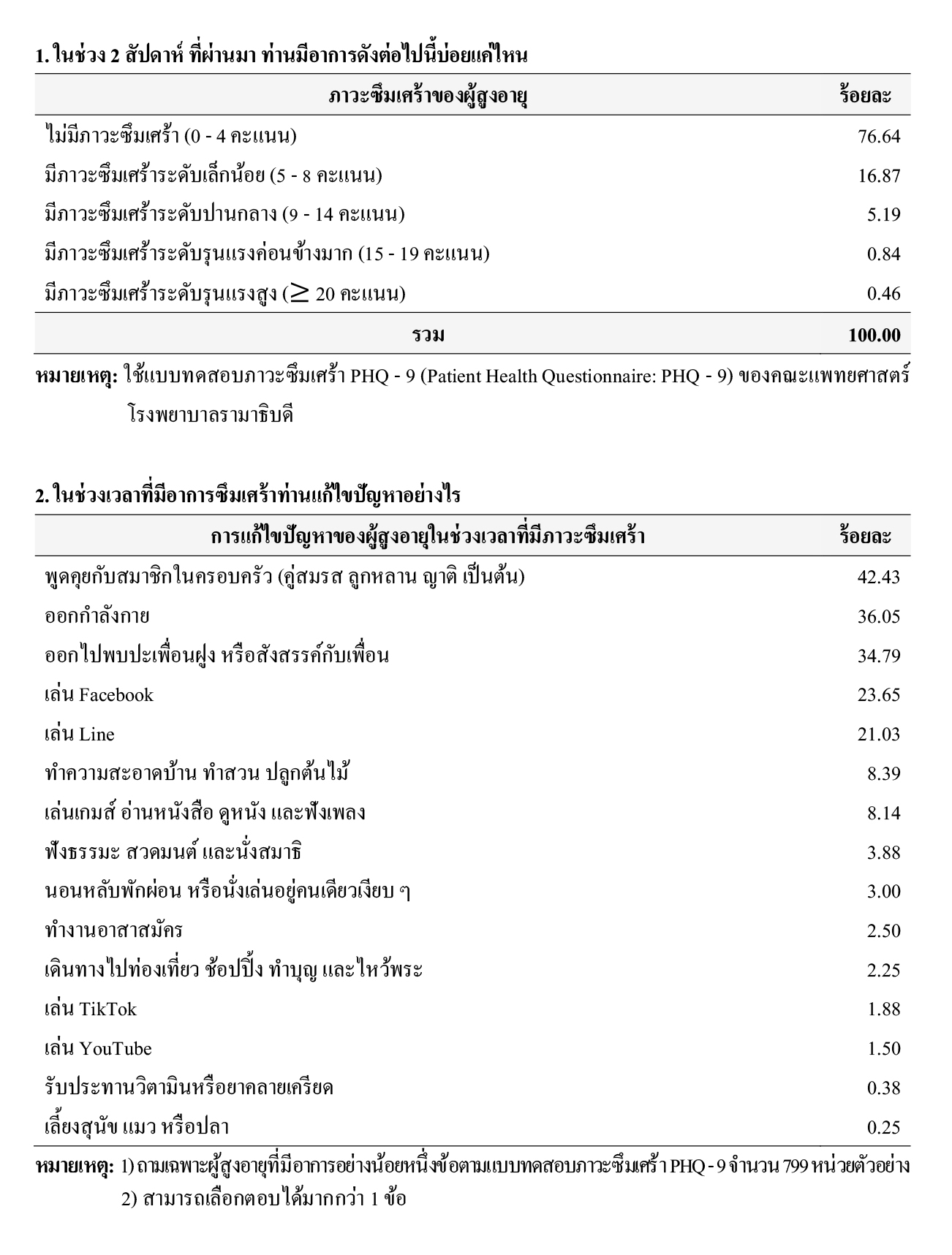 ส่วนการแก้ไขปัญหาของผู้สูงอายุในช่วงที่มีภาวะซึมเศร้า (ถามเฉพาะผู้สูงอายุที่มีอาการอย่างน้อยหนึ่งข้อตามแบบทดสอบภาวะซึมเศร้า PHQ – 9 จำนวน 799 หน่วยตัวอย่าง) พบว่า ผู้สูงอายุ ร้อยละ 42.43 ระบุว่า พูดคุยกับสมาชิกในครอบครัว (คู่สมรส ลูกหลาน ญาติ เป็นต้น) รองลงมา ร้อยละ 36.05 ระบุว่า ออกกำลังกาย ร้อยละ 34.79 ระบุว่า ออกไปพบปะเพื่อนฝูง หรือสังสรรค์กับเพื่อน ร้อยละ 23.65 ระบุว่า เล่น Facebook ร้อยละ 21.03 ระบุว่า เล่น Line ร้อยละ 8.39 ระบุว่า ทำความสะอาดบ้าน ทำสวน ปลูกต้นไม้ ร้อยละ 8.14 ระบุว่า เล่นเกมส์ อ่านหนังสือ ดูหนัง และฟังเพลง ร้อยละ 3.88 ระบุว่า ฟังธรรมะ สวดมนต์ และนั่งสมาธิ ร้อยละ 3.00 ระบุว่า นอนหลับพักผ่อน หรือนั่งเล่นอยู่คนเดียวเงียบ ๆ ร้อยละ 2.50 ระบุว่า ทำงานอาสาสมัคร ร้อยละ 2.25 ระบุว่า เดินทางไปท่องเที่ยว