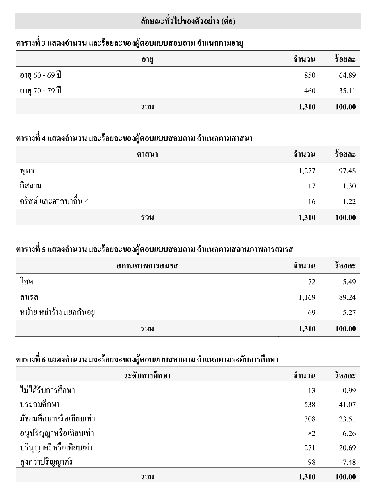 ตัวอย่าง ร้อยละ 64.89 อายุ 60 - 69 ปี และร้อยละ 35.11 อายุ 70 - 79 ปี โดยตัวอย่าง ร้อยละ 97.48 นับถือศาสนาพุทธ ร้อยละ 1.30 นับถือศาสนาอิสลาม และร้อยละ 1.22 นับถือศาสนาคริสต์ และศาสนาอื่น ๆ