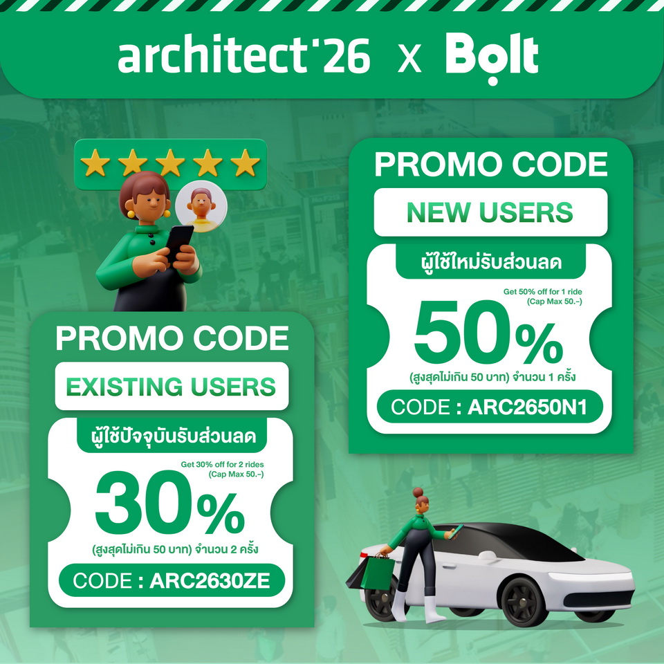 งานสถาปนิก 69 เตรียมมอบสิทธิพิเศษสำหรับผู้เข้าชมงานทั้งด้านการเดินทางและที่พัก เพื่ออำนวยความสะดวกให้ผู้เข้าร่วมงานได้เดินทางและพักผ่อนอย่างสะดวกสบายตลอดช่วงการจัดงาน โดยปีนี้ผู้จัดงานได้ร่วมมือกับพันธมิตรด้านบริการเดินทางและที่พัก ได้แก่ LINE MAN RIDE, Bolt และ TK Palace Hotel & Convention สำหรับ LINE MAN RIDE มอบส่วนลดค่าโดยสาร 20% สำหรับบริการ Eco และ Bike เพียงใส่โค้ด ARCRIDE50 รับส่วนลดสูงสุด 50 บาท จำนวน 2 ครั้งต่อผู้ใช้ ขณะเดียวกัน Bolt มอบส่วนลดพิเศษสำหรับการเดินทางมายังงาน โดยผู้ใช้ใหม่ รับส่วนลด 50% สูงสุด 50 บาท จำนวน 1 ครั้ง เพียงใส่โค้ด ARC2650N1 และสำหรับผู้ใช้ปัจจุบัน รับส่วนลด 30% สูงสุด 50 บาท จำนวน 2 ครั้ง เมื่อใส่โค้ด ARC2630ZE