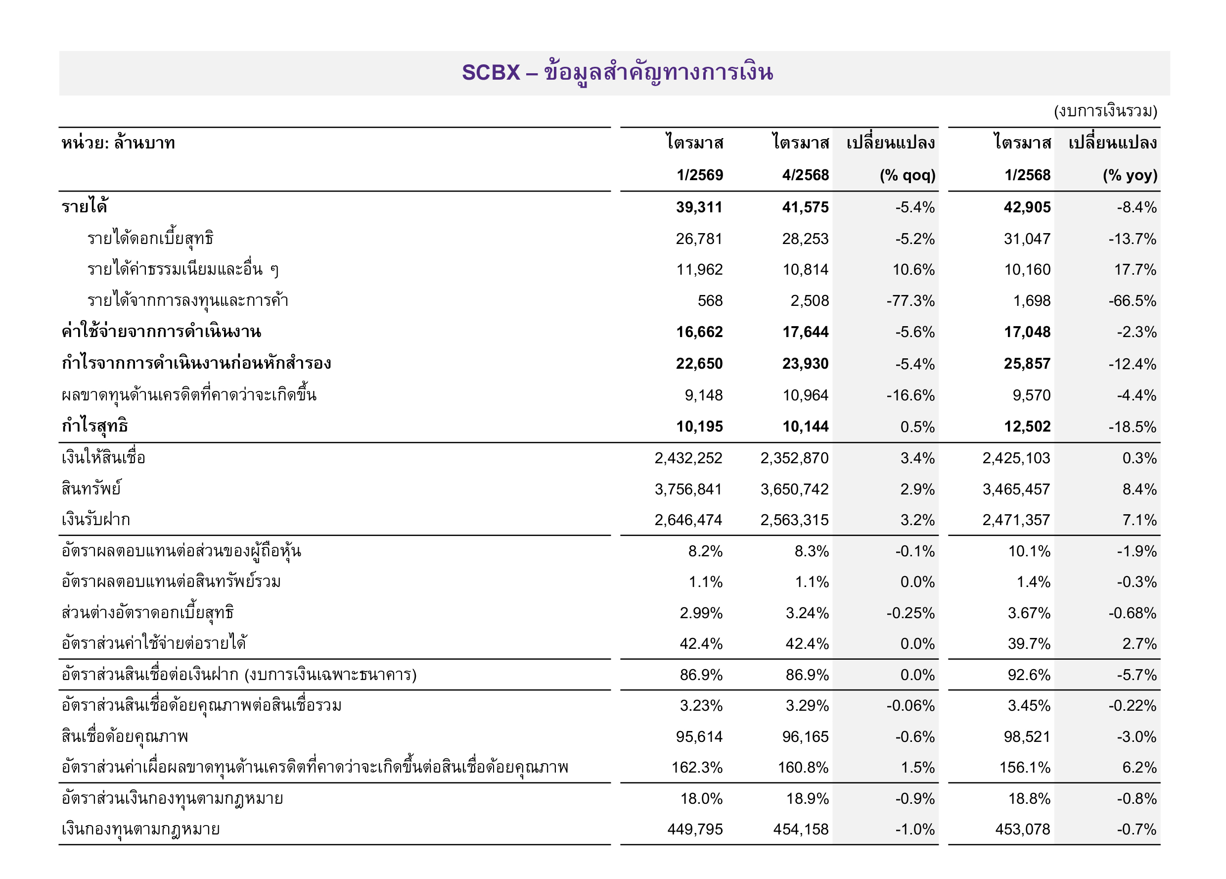 บริษัท เอสซีบี เอกซ์ จำกัด (มหาชน) มีกำไรสุทธิในไตรมาส 1 ของปี 2569 จำนวน 10,195 ล้านบาท ลดลง 18.5% เมื่อเทียบกับช่วงเดียวกันของปีก่อนหน้า จากรายได้ดอกเบี้ยสุทธิที่ลดลงซึ่งเป็นผลจากการปรับลดอัตราดอกเบี้ยนโยบายและกำไรจากการลงทุนที่ลดลง ทั้งนี้ รายได้ค่าธรรมเนียมปรับเพิ่มขึ้นในทุกหมวดหลัก ขณะที่ค่าใช้จ่ายในการดำเนินงานและการตั้งสำรองปรับลดลง