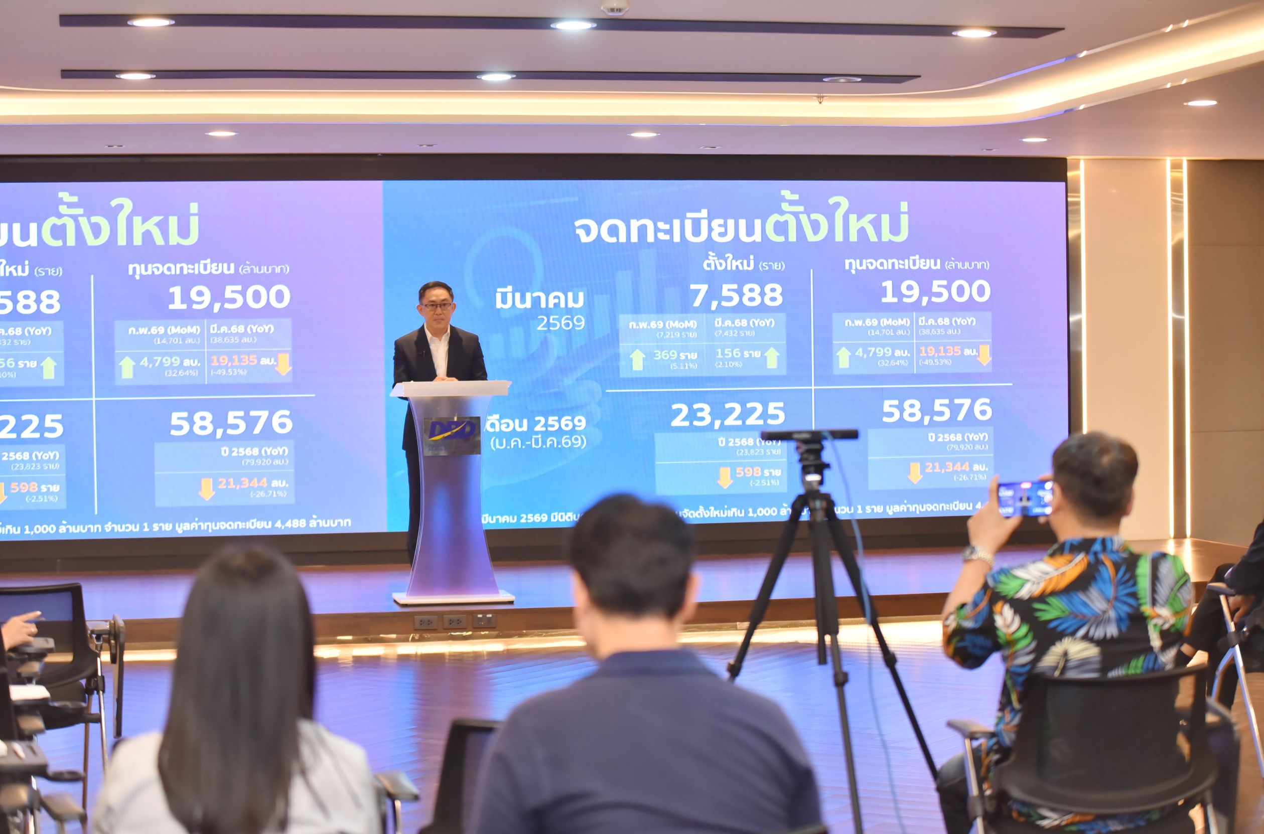 ขณะที่ทุนจดทะเบียนอยู่ที่ 19,500 ล้านบาท เมื่อเทียบกับเดือนที่ผ่านมา (MoM) เดือนกุมภาพันธ์ 2569 (14,701 ล้านบาท) เพิ่มขึ้น 4,799 ล้านบาท คิดเป็น 32.64% และเมื่อเทียบกับช่วงเวลาเดียวกันของปีที่ผ่านมา (YoY) เดือนมีนาคม 2568 (38,635 ล้านบาท) ลดลง 19,135 ล้านบาท คิดเป็น 49.53%