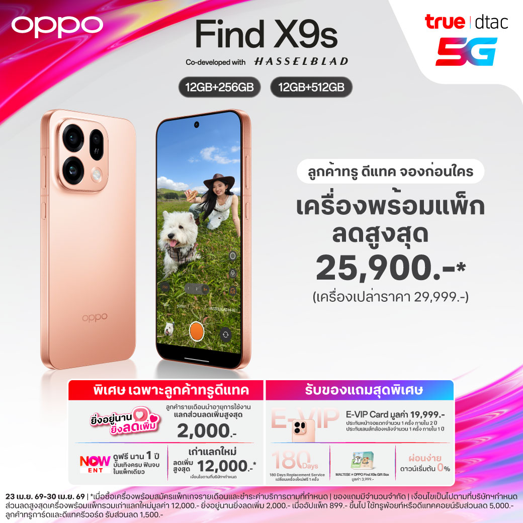 และสำหรับ OPPO Find X9s สมาร์ตโฟนแฟลกชิปขนาดพกพา สำหรับสายท่องเที่ยว และคอนเทนต์ครีเอเตอร์ มาพร้อมเครื่องพร้อมแพ็กรับส่วนลดสูงสุด 25,900 บาท เครื่องเปล่าเริ่ม 29,999 บาท มาพร้อมโปรจัดเต็ม รับฟรี!