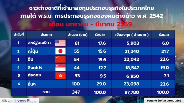 ทั้งนี้ เฉพาะเดือนมีนาคม 2569 มีการอนุญาตให้คนต่างชาติประกอบธุรกิจในประเทศไทย 104 ราย เป็นการลงทุนผ่านช่องทางการขอรับใบอนุญาตประกอบธุรกิจของคนต่างด้าว 31 ราย และการขอหนังสือรับรองการประกอบธุรกิจของคนต่างด้าว (ผ่านช่องทางการลงทุนตามกฎหมายว่าด้วยการส่งเสริมการลงทุน หรือได้รับอนุญาตตามกฎหมายว่าด้วยการนิคมอุตสาหกรรมแห่งประเทศไทย และการใช้สิทธิตามสนธิสัญญาหรือความตกลงระหว่างประเทศ) 73 ราย เงินลงทุนรวมทั้งสิ้น 33,351 ล้านบาท ส่วนใหญ่เป็นคนต่างชาติจาก สิงคโปร์ ญี่ปุ่น และสหรัฐอเมริกา ตามลำดับ มีการจ้างงานคนไทยจากนักลงทุนที่ขอรับใบอนุญาตประกอบธุรกิจของคนต่างด้าว 494 คน รวมถึงมีการถ่ายทอดเทคโนโลยีอันเป็นองค์ความรู้เฉพาะด้านโดยตรงจากประเทศผู้เข้ามาลงทุนให้แก่คนไทย เช่น องค์ความรู้เกี่ยวกับการตรวจสอบด้านสิ่งแวดล้อมและการควบคุมสถานีจ่ายน้ำมันและก๊าซ องค์ความรู้เกี่ยวกับการวิเคราะห์ของเสีย และนวัตกรรมการเพิ่มอัตราการรีไซเคิล และองค์ความรู้เกี่ยวกับระบบบริหารจัดคลังสินค้า เป็นต้น