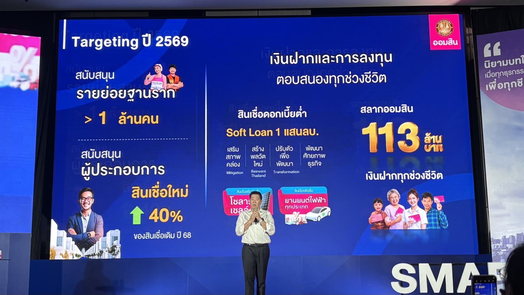 นอกจากนี้ ในปี 2569 ธนาคารออมสินตั้งเป้าขยายสินเชื่อผู้ประกอบการมากกว่า 40% ของพอร์ตสินเชื่อรวม ควบคู่กับโครงการสินเชื่อดอกเบี้ยต่ำ (Soft Loan) วงเงินกว่า 100,000 ล้านบาท เพื่อช่วยสร้างสภาพคล่องและโอกาสทางธุรกิจสำหรับผู้ประกอบการรายเล็กธุรกิจ SMEs และ Supply Chain ให้สามารถเดินหน้าต่อได้ ครอบคลุมไปจนถึงการลงทุนในพลังงานสะอาด เช่น โซลาร์เซลล์ และยานยนต์ไฟฟ้า (EV) และการสนับสนุนธุรกิจในภาคเศรษฐกิจอื่น ๆ เพื่อรับมือกับความผันผวนที่อาจเกิดขึ้นในอนาคต และการเติมสภาพคล่องให้ธุรกิจที่ได้รับผลกระทบจากเศรษฐกิจ