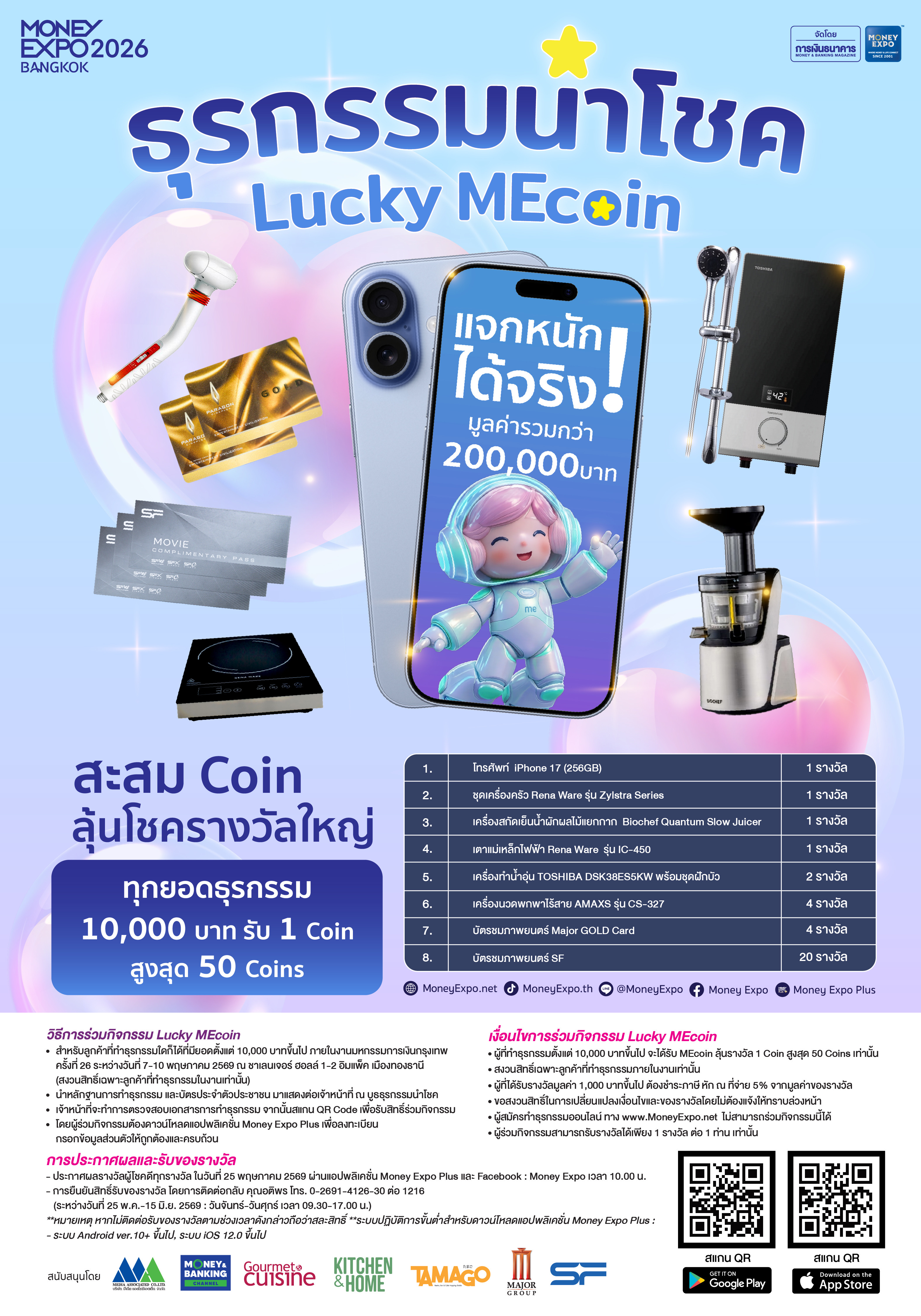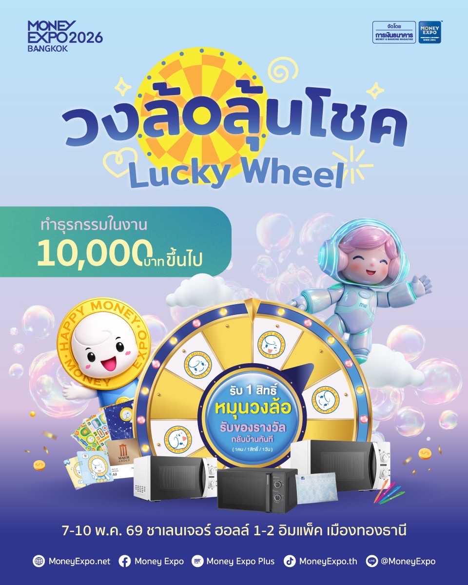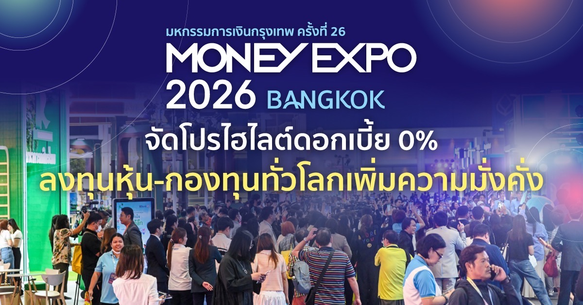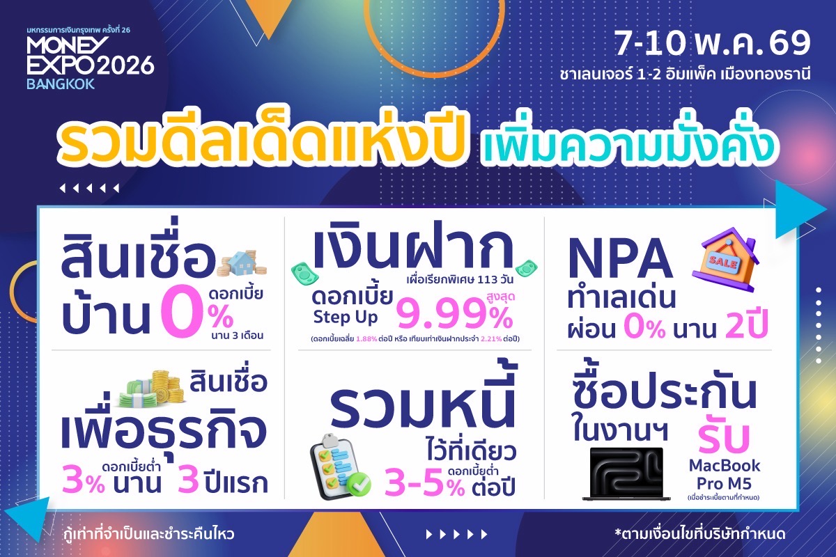 มหกรรมการเงินกรุงเทพ ครั้งที่ 26 MONEY EXPO 2026 BANGKOK ยกทัพแบงก์ บล. บลจ. ประกัน หน่วยงานรัฐ-เอกชนชั้นนำทั่วประเทศ จัดเต็มโปรโมชั่นครั้งใหญ่แห่งปี เพิ่มโอกาสสร้างความมั่งคั่ง ช่วยลดภาระทางการเงิน อาทิ สินเชื่อบ้าน 0% นาน 3 เดือน กู้ซื้อทรัพย์ NPA 0% นาน 2 ปี เงินฝากเผื่อเรียกพิเศษ 113 วัน ดอกเบี้ย Step up สูงสุด 9.99% (เฉลี่ย 1.88% ต่อปี) สินเชื่อ SME ดอกเบี้ยต่ำ 3% นาน 3 ปี สินเชื่อส่วนบุคคล ดอกเบี้ยเริ่มต้น 9.99% รวมหนี้ไว้ที่เดียว ดอกเบี้ยต่ำ 3-5% ต่อปี ซื้อประกันในงานผ่อน 0% นาน 10 เดือน รับ MacBook Pro M5 พร้อมต่อยอดความมั่งคั่งด้วยการลงทุนหุ้น ทอง กองทุนทั่วโลก ฟังฟรี! สัมมนาปลุกสกิล AI ด้านการเงิน-การลงทุน โดยกูรูชั้นนำระดับประเทศ พร้อมกิจกรรมตลอด 4 วันเต็ม วันที่ 7-10 พฤษภาคม 2569 ณ ชาเลนเจอร์ ฮอลล์ 1-2 อิมแพ็ค เมืองทองธานี