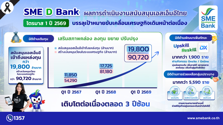 ส่งผลให้ผลการดำเนินงาน SME D Bank ไตรมาสแรกของปี 2569 เป็นไปตามเป้าหมาย สามารถสนับสนุนผู้ประกอบการเอสเอ็มอีเข้าถึงแหล่งทุนกว่า 19,800 ล้านบาท สูงกว่า 11.75% เมื่อเทียบช่วงเดียวกันของปีก่อน (2568) ส่วนมากเป็นการเติมทุนให้แก่ผู้ประกอบการรายเล็ก วงเงินไม่เกิน 15 ล้านบาทต่อราย ก่อให้เงินหมุนเวียนในระบบเศรษฐกิจกว่า 90,720 ล้านบาท ช่วยรักษาการจ้างงานกว่า 541,700 ราย ขณะที่ยอดสินเชื่อคงค้าง (Outstanding) อยู่ที่มากกว่า 100,000 ล้านบาท สูงขึ้นกว่า 3.05% เมื่อเทียบช่วงเดียวกันของปีก่อน