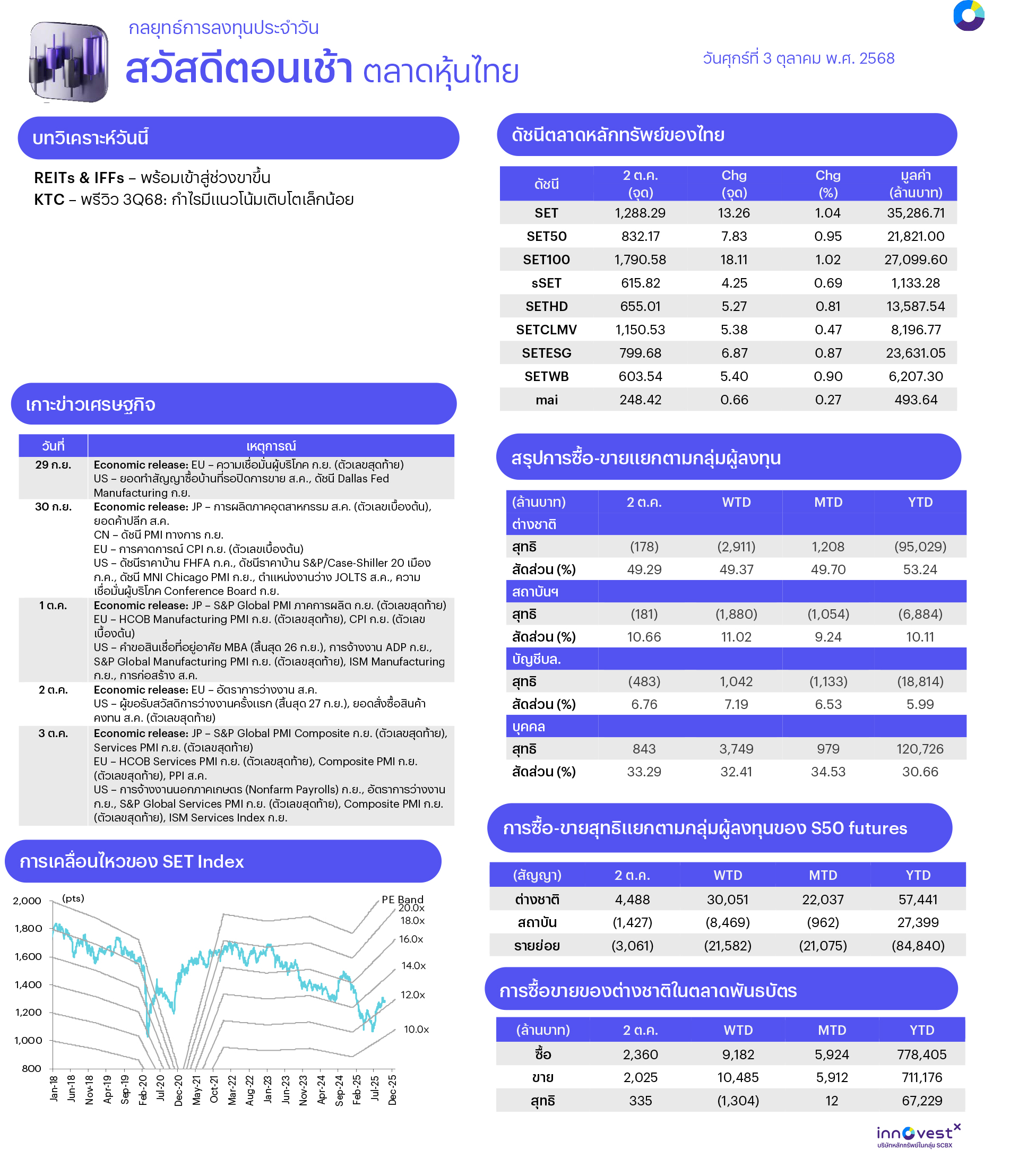 คาดตลาดแกว่งตัวไซด์เวย์ในกรอบ NFP สหรัฐฯ ในคืนนี้คาดว่ายังไม่สามารถรายงานได้ในช่วงปิดหน่วยงานราชการ ตลาดคงคาดว่าภาคแรงงานสหรัฐฯ ยังแย่ตามตัวเลข ADP ที่ออกไปก่อนหน้า แม้เป็นสัญญาณลดดอกเบี้ยเฟดหนุนเงินไหลเข้า แต่นักลงทุนต่างชาติกลับมาขายสุทธิวันก่อน ทำให้ยังระมัดระวัง ทางเทคนิคตลาดยังแกว่งตัวในกรอบ ยังไม่สามารถยืนเหนือแนวต้าน 1290-1293 ได้ การยืนเหนือได้จึงจะเป็นสัญญาณบวก ส่วนการลงมีกรอบล่างที่ 1268 รอเบรก