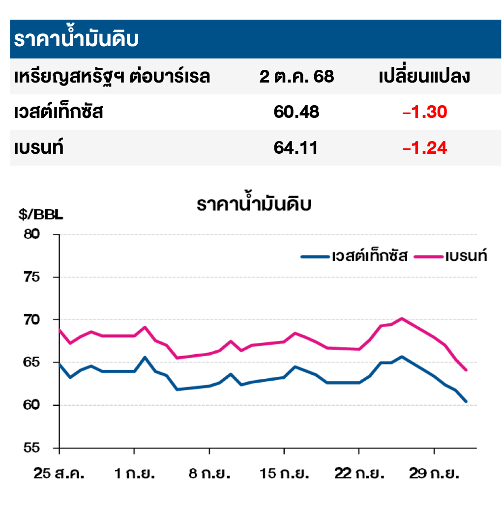 (-) ราคาน้ำมันดิบเวสต์เท็กซัสและเบรนท์ปรับลดลงประมาณ 2% และเป็นการปรับตัวลดลงแตะระดับต่ำสุดในรอบ 4 เดือน หลังคาดการณ์ว่ากลุ่ม OPEC+ มีแนวโน้มที่จะปรับเพิ่มกำลังการผลิตน้ำมันมากถึง 0.5 ล้านบาร์เรลต่อวันในเดือน พ.ย. 68 เนื่องจากซาอุดีอาระเบียพยายามที่จะทวงคืนส่วนแบ่งตลาด ซึ่งส่งผลให้นักลงทุนวิตกกังวลเกี่ยวกับภาวะอุปทานน้ำมันล้นตลาด