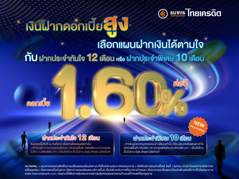 โปรโมชัน! พิเศษ รับดอกเบี้ยสูงทันทีกับ "ฝากประจำทันใจ" ธนาคารไทยเครดิต ยิ่งฝากมาก ยิ่งรับมาก