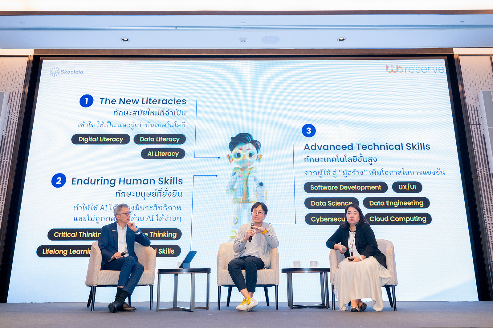 ดร.วิโรจน์ จิรพัฒนกุล กรรมการผู้จัดการและผู้ก่อตั้ง Skooldio ได้แบ่งปันประสบการณ์ว่า ทักษะแห่งอนาคตที่คนรุ่นใหม่ควรเตรียมไว้ สามารถสรุปได้เป็น 3 ประเด็นหลักๆ คือ 1) The New Literacies หรือทักษะสมัยใหม่ที่จำเป็น คือ การเข้าใจและรู้เท่าทันเทคโนโลยี เช่น Digital Literacy, Data Literacy และ AI Literacy ซึ่งเป็นพื้นฐานที่ต้องมี ซึ่งหากเข้าใจและเปิดรับสิ่งเหล่านี้จะเป็นเครื่องมือที่ช่วยยกระดับความรู้ความสามารถได้ 2) Enduring Human Skills หรือทักษะมนุษย์ที่ยั่งยืน คือทักษะที่ไม่มีอะไรทดแทนได้และช่วยให้เราใช้ AI ได้อย่างมีประสิทธิภาพและไม่ถูกแทนที่ด้วย AI ไปได้ง่ายๆ เช่น Critical Thinking และ Creative Thinking ที่เป็นทักษะอันดับต้นๆ ซึ่งจะช่วยขยายศักยภาพในการใช้ AI ให้กว้างไกลขึ้น รวมถึงการมี Interpersonal Skill และการเรียนรู้แบบ Lifelong Learning ซึ่งช่วยส่งเสริมให้คนรุ่นใหม่เรียนรู้ได้ตลอดเวลา และ 3) Advanced Technical Skills หรือทักษะเทคโนโลยีขั้นสูง เช่น Software Development, UX/UI, Cloud Computing เพราะโลกในอนาคตจะเป็นโลกของผู้สร้าง ทักษะในกลุ่มนี้จะช่วยพัฒนาจากผู้ใช้เทคโนโลยีสู่การเป็นผู้สร้างเทคโนโลยี เพิ่มโอกาสในการแข่งขันได้ดียิ่งขึ้นได้ ซึ่งการศึกษาในระบบของต่างประเทศนั้นช่วยส่งเสริมทักษะเหล่านี้ให้บุตรหลานได้