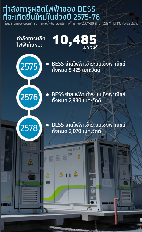 ปัจจุบัน ภาครัฐได้มีการบรรจุแผนพัฒนาโครงการระบบกักเก็บพลังงาน (ระบบ BESS) ไว้ในร่างแผนพัฒนากำลังผลิตกำลังไฟฟ้าของประเทศไทย พ.ศ.2567-2580 (ร่างแผน PDP2024) ซึ่งจากร่างแผนดังกล่าว ภาครัฐมีแผนที่จะให้การไฟฟ้าฝ่ายผลิตแห่งประเทศไทย (กฟผ.) หรือ/และภาคเอกชนลงทุนระบบ BESS ทั้งหมดราว 10,485 เมกะวัตต์ เพื่อเพิ่มความมั่นคงและเสถียรภาพของระบบไฟฟ้า และรักษาความต่อเนื่องของไฟฟ้าจากโรงไฟฟ้าจากพลังงานหมุนเวียนบางประเภท โดยคาดว่าจะจ่ายไฟฟ้าจากระบบ BESS นี้เข้าระบบเชิงพาณิชย์ในช่วงปี 2575-784