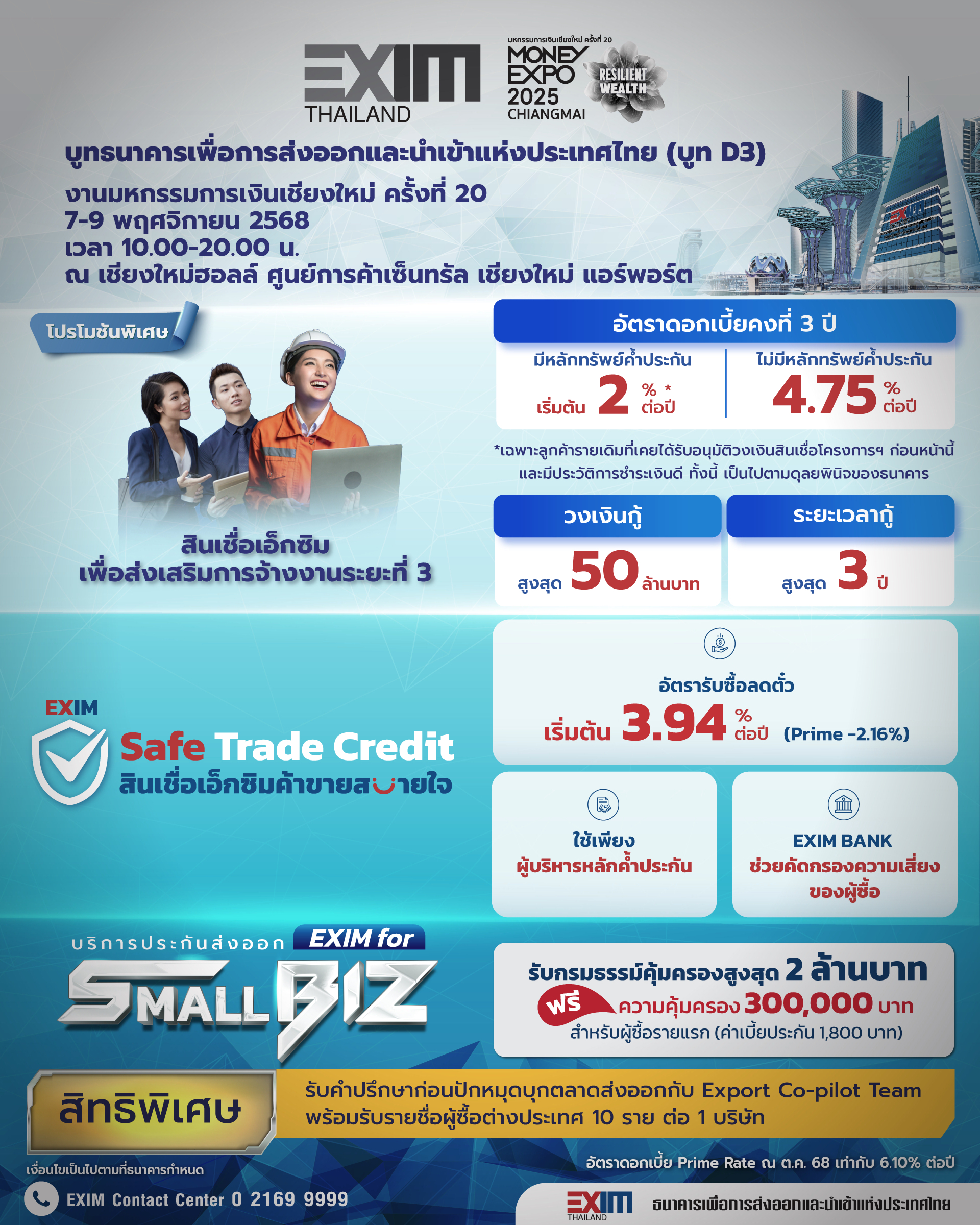 ธนาคารเพื่อการส่งออกและนำเข้าแห่งประเทศไทย (EXIM BANK) จัดเต็มบริการทางการเงิน พร้อมโปรโมชันพิเศษ ในงานมหกรรมการเงินเชียงใหม่ ครั้งที่ 20 (Money Expo 2025 Chiang Mai) ระหว่างวันศุกร์ที่ 7-วันอาทิตย์ที่ 9 พฤศจิกายน 2568 ณ บูท D3 เชียงใหม่ฮอลล์ ศูนย์การค้าเซ็นทรัล เชียงใหม่ แอร์พอร์ต ภายใต้แนวคิด “Empowering Toward a Sustainable Wealth เสริมพลัง เพื่อสร้างความมั่งคั่งอย่างยั่งยืน” โปรโมชันพิเศษ เสริมศักยภาพผู้ประกอบการไทยก้าวผ่านทุกความท้าทาย เติบโตอย่างแข็งแกร่ง