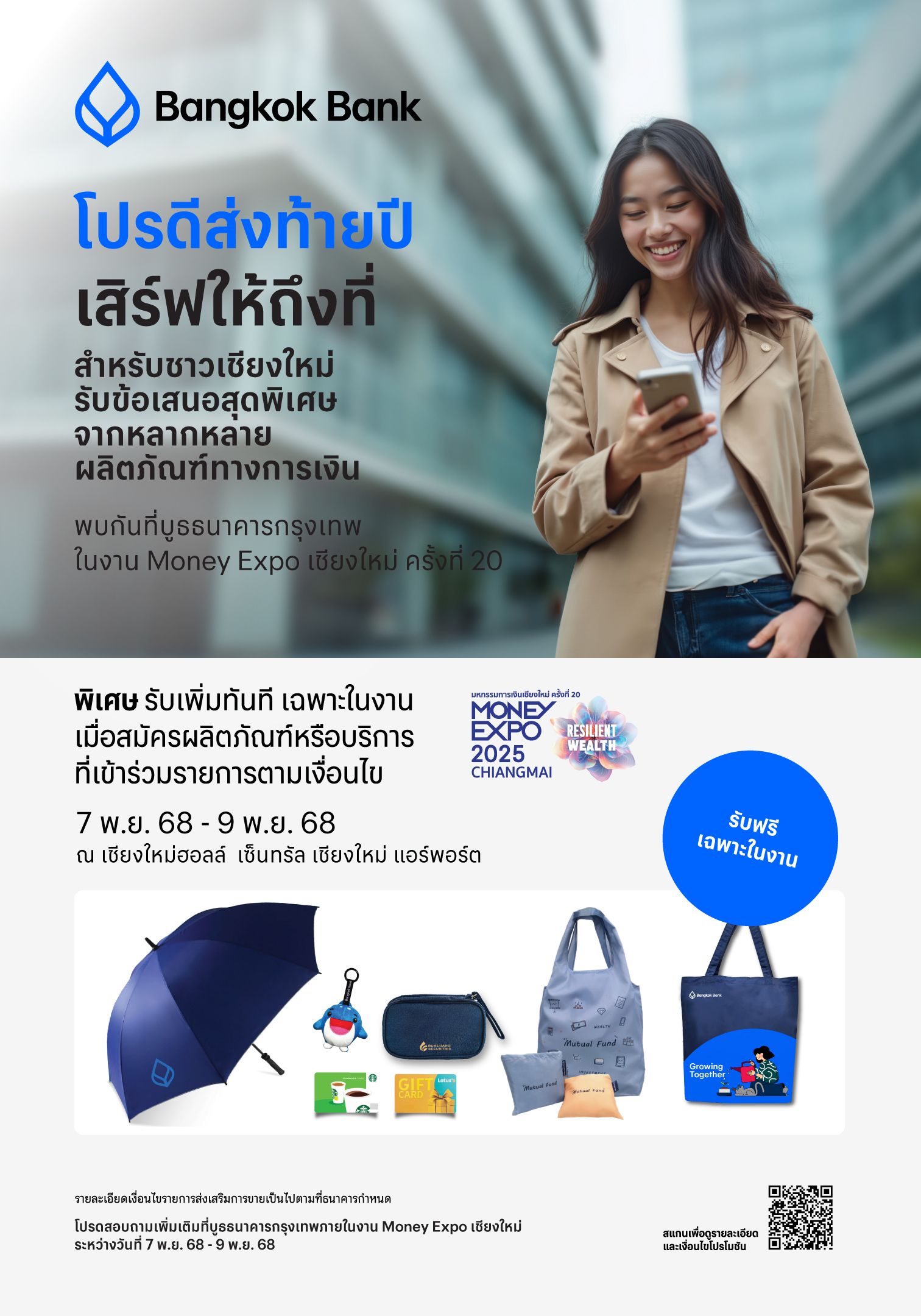 ผู้สนใจสามารถขอรับคำปรึกษาด้านการเงิน การลงทุน หรือสมัครบริการต่างๆ ที่มาพร้อมกับโปรโมชันพิเศษ ได้ที่บูธธนาคารกรุงเทพ ในงานมหกรรมการเงินเชียงใหม่ ครั้งที่ 20 (Money Expo Chiangmai 2025) ระหว่างวันที่ 7 – 9 พฤศจิกายน 2568 ณ เชียงใหม่ ฮอลล์ ศูนย์การค้าเซ็นทรัล เชียงใหม่ แอร์พอร์ต./