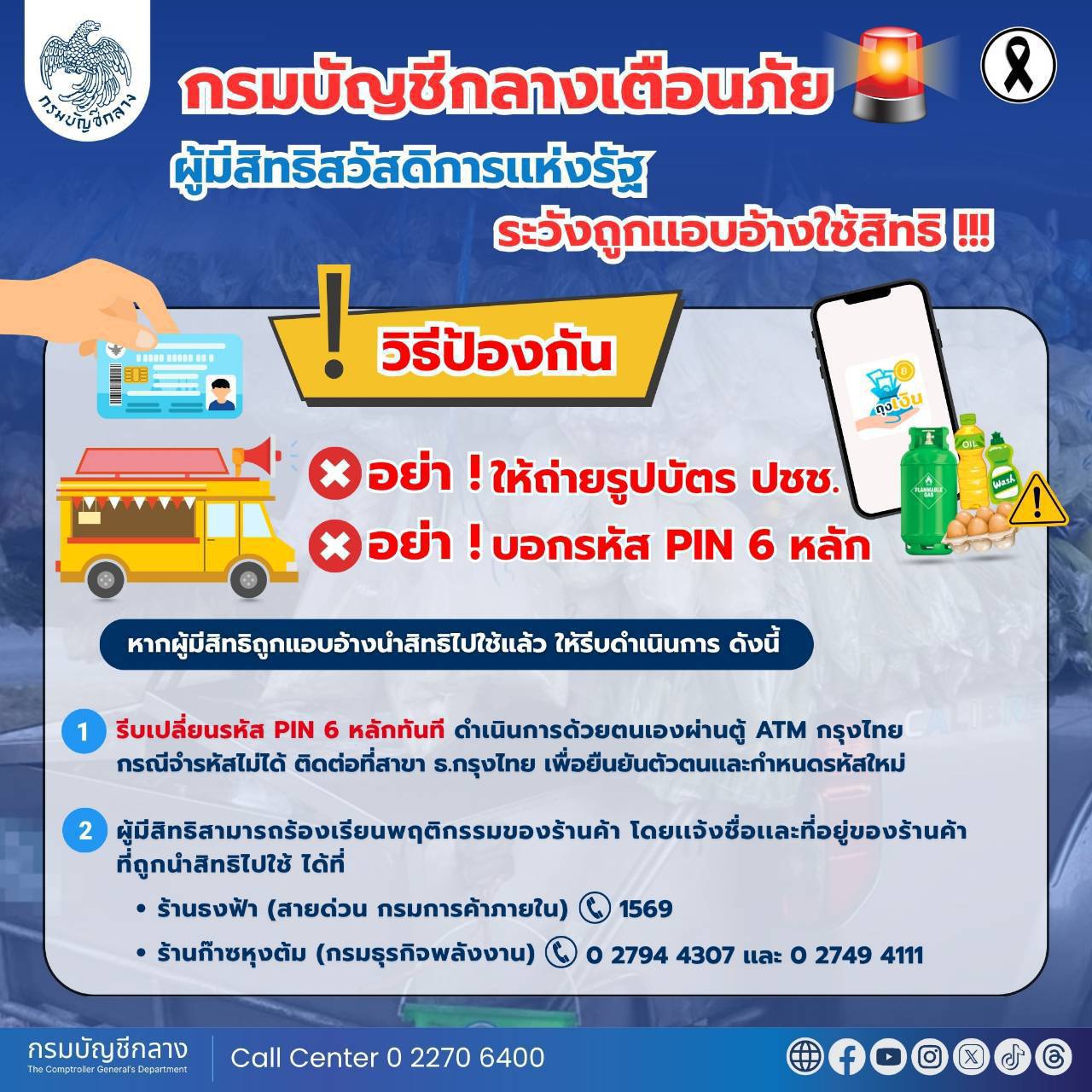นายธนะโชค รุ่งธิปานนท์ รองอธิบดีกรมบัญชีกลาง ในฐานะโฆษกกรมบัญชีกลาง เปิดเผยว่า กรมบัญชีกลางได้รับแจ้งจากผู้มีสิทธิสวัสดิการแห่งรัฐหลายรายไม่สามารถใช้สิทธิสวัสดิการได้ เนื่องจากถูกแอบอ้างนำสิทธิไปใช้ที่ร้านค้าข้ามพื้นที่ (ต่างจังหวัด) ซึ่งผู้มีสิทธิไม่ได้เป็นผู้ใช้สิทธิดังกล่าว และจากการตรวจสอบพบว่า เกิดจากร้านค้าที่เข้าร่วมโครงการลงทะเบียนเพื่อสวัสดิการแห่งรัฐ ตระเวนขายสินค้าด้วยรถเร่ในพื้นที่ต่าง ๆ และใช้แอปพลิเคชันถุงเงินในการรับชำระวงเงินค่าซื้อสินค้าจากร้านธงฟ้า และส่วนลดค่าซื้อก๊าซหุงต้ม โดยหลอกให้ผู้มีสิทธิไปซื้อของราคาถูกหรือแลกของ เช่น ไข่ น้ำมันพืช เป็นต้น โดยวิธีการของมิจฉาชีพที่เป็นร้านค้าดังกล่าว จะทำการถ่ายภาพบัตรประจำตัวประชาชน และรหัสคู่บัตร (PIN Code) 6 หลัก ที่ผู้มีสิทธิใช้ จากนั้นจะทำการส่งต่อข้อมูลผู้มีสิทธิให้กับร้านค้าอื่น ทั้งร้านธงฟ้าและร้านค้าก๊าซหุงต้ม แล้วทำการตัดวงเงินสิทธิสวัสดิการแห่งรัฐของผู้มีสิทธิในเดือนถัดไป ทำให้ผู้มีสิทธิไม่สามารถใช้สิทธิได้ และเมื่อผู้มีสิทธิโทรไปตรวจสอบกับ Call Center บัตรสวัสดิการแห่งรัฐ 0 2109 2345 พบว่าสิทธิของท่านถูกนำไปใช้กับร้านค้าที่อยู่ข้ามพื้นที่ในต่างจังหวัดแล้ว ทั้งที่ไม่เคยเดินทางไปยังจังหวัดนั้น ๆ ดังนั้น ขอให้ผู้มีสิทธิสวัสดิการแห่งรัฐโปรดระมัดระวัง ไม่ควรให้บัตรประจำตัวประชาชนหรือบอก PIN Code 6 หลัก กับร้านค้าหรือรถเร่ที่ไม่น่าเชื่อถือโดดเด็ดขาด