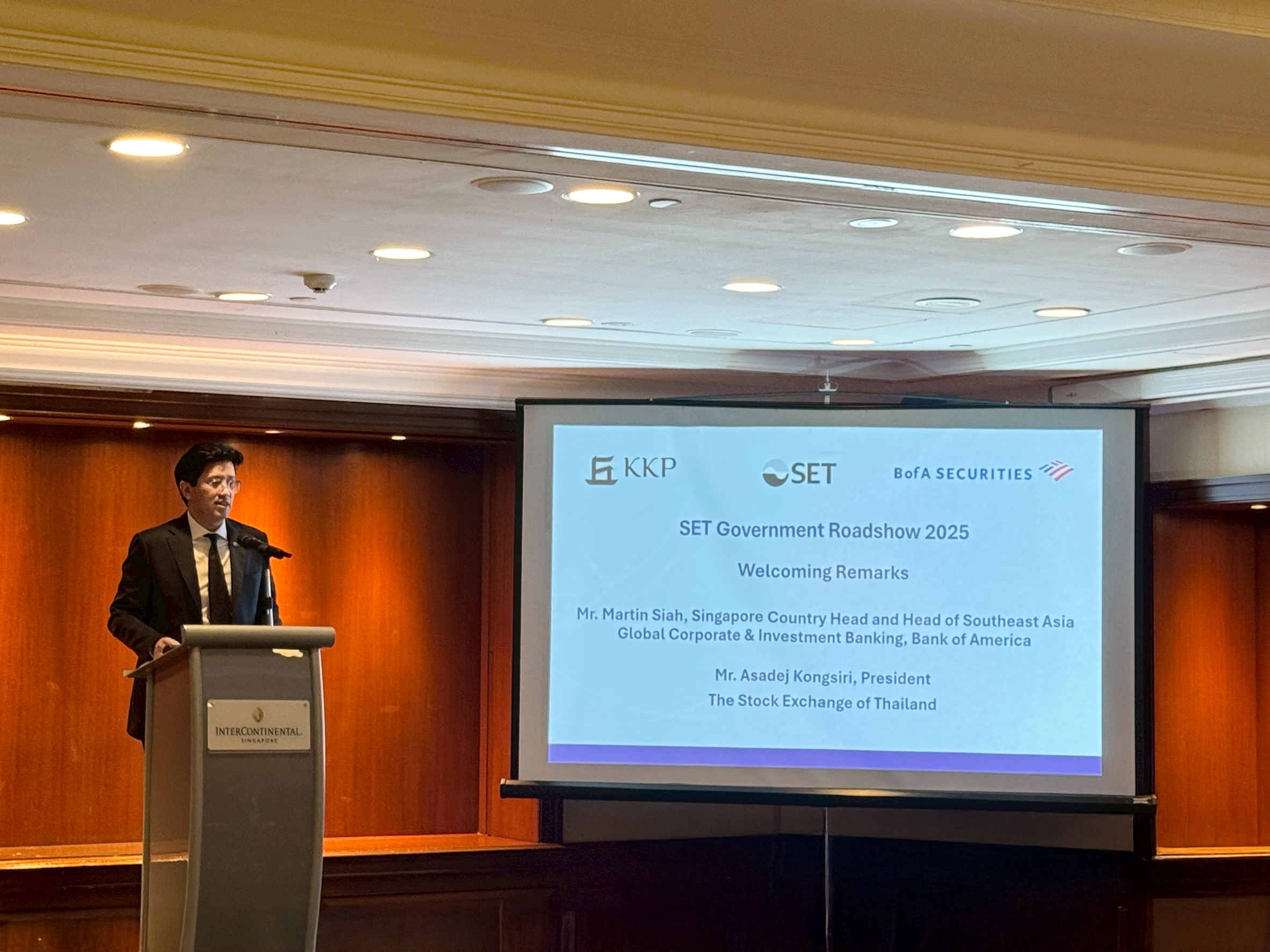 ตลาดหลักทรัพย์แห่งประเทศไทยร่วมกับ บริษัทหลักทรัพย์ เกียรตินาคินภัทร จำกัด (มหาชน) และ Bank of America Securities จัดงาน "SET Government Roadshow 2025" ที่ประเทศสิงคโปร์ เมื่อวันที่ 7 พฤศจิกายน โดยได้รับเกียรติจากนายอนุทิน ชาญวีรกูล นายกรัฐมนตรี พร้อมด้วย นายเอกนิติ นิติทัณฑ์ประภาศ รองนายกรัฐมนตรีและรัฐมนตรีว่าการกระทรวงการคลัง และนางศุภจี สุธรรมพันธุ์ รัฐมนตรีว่าการกระทรวงพาณิชย์ นำทีมนำเสนอศักยภาพและโอกาสการลงทุนในประเทศไทยแก่ผู้ลงทุนสถาบันและภาคเอกชนชั้นนำกว่า 120 รายในสิงคโปร์