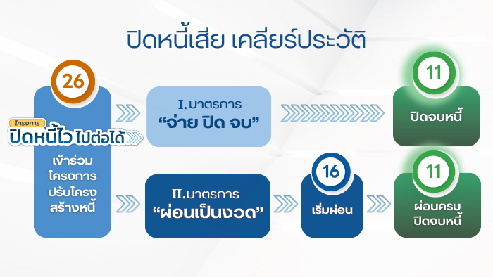 ทั้งนี้ ลูกหนี้ที่เข้าร่วมโครงการจะได้รับการปรับโครงสร้างหนี้แบบผ่อนปรนมากกว่าปกติเพื่อลดภาระหนี้ อาทิเช่น ยกเว้นดอกเบี้ยคงค้างทั้งหมดและค่าธรรมเนียม ลดยอดเงินต้นบางส่วน เป็นต้น ทำให้ลูกหนี้สามารถกลับมาจ่ายชำระได้และปิดจบหนี้ได้เร็วขึ้น รวมทั้งกลับมามีประวัติการชำระหนี้ในเครดิตบูโรที่ดีขึ้นและมีโอกาสเข้าถึงสินเชื่อในระบบได้อีกครั้ง โดยมี 2 มาตรการ ได้แก่ (1) จ่ายปิดจบ ให้ลูกหนี้จ่ายชำระหนี้บางส่วนเพื่อปิดจบหนี้ในทันที และ (2) ผ่อนชำระหนี้เป็นงวด ให้ลูกหนี้ผ่อนชำระเป็นระยะเวลาสูงสุดถึง 3 ปี และจะได้รับการยกเว้นดอกเบี้ยเงินกู้ในระหว่างที่เข้าร่วมมาตรการ หากปฏิบัติได้ตามเงื่อนไข