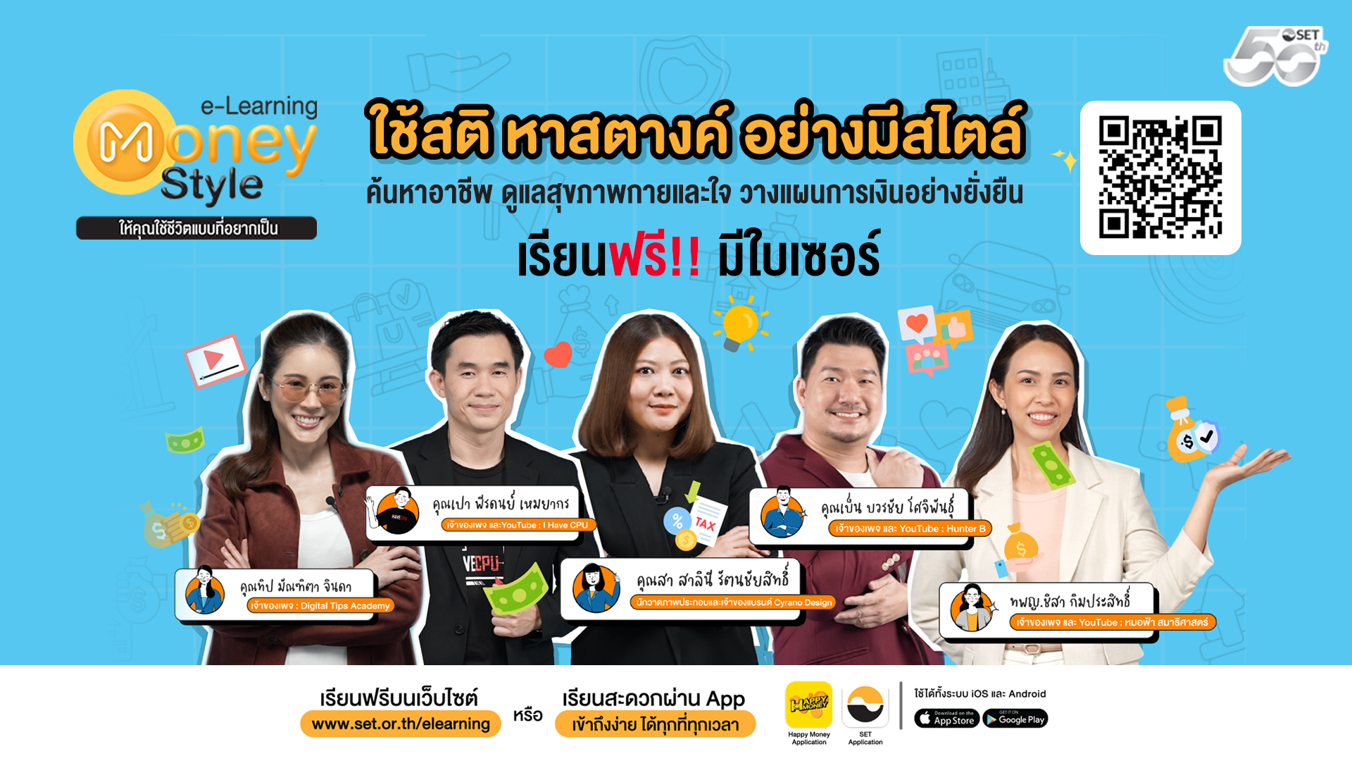 ซีรีส์ “SET e-Learning Money Style” มีรวม 26 หลักสูตร และมียอดเข้าเรียนสะสมกว่า 3 ล้านครั้งตลอด 4 ซีซั่นที่ผ่านมา เหมาะสำหรับผู้เรียนทุกช่วงวัย เข้าใจง่ายและนำไปใช้ได้จริงทันที ผู้สนใจเรียนฟรีพร้อมรับวุฒิบัตรได้ที่ https://elearning.set.or.th/SETGroup/categories/174 หรือผ่าน “Happy Money App”