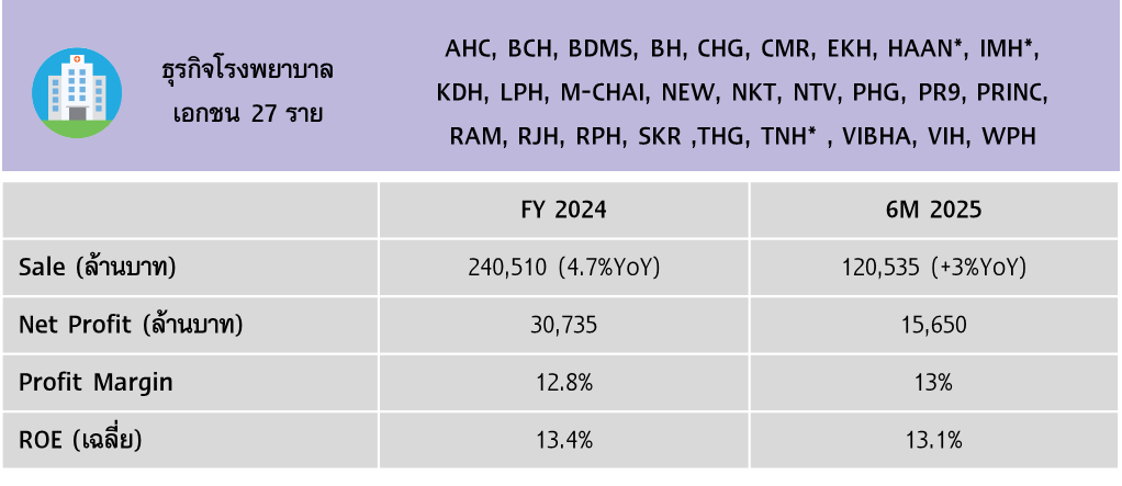 ธุรกิจโรงพยาบาลเอกชน คือธุรกิจที่ให้บริการทางการแพทย์ภายใต้การบริหารของภาคเอกชน โดยโรงพยาบาลเอกชนในไทย ณ เดือนมิถุนายนปี 2025 มีจำนวนทั้งสิ้น 456 แห่ง คิดเป็นราว 30% ของจำนวนโรงพยาบาลทั่วประเทศ มีเตียงผู้ป่วยรวมกันทั้งสิ้น 4.2 หมื่นเตียง และกว่า 153 แห่งอยู่ในกรุงเทพฯ ทั้งนี้โรงพยาบาลเอกชนสามารถแบ่งประเภทได้หลายรูปแบบตามเกณฑ์ที่กำหนด เช่น จำนวนเตียง (ขนาดเล็ก, ขนาดกลาง และขนาดใหญ่), ลักษณะการให้บริการ (โรคทั่วไป และเฉพาะทาง), ความซับซ้อนทางการแพทย์ (ปฐมภูมิ, ทุติยภูมิ และตติยภูมิ) และกลุ่มผู้ป่วยเป้าหมาย (ชาวไทย และชาวต่างชาติ) สำหรับผู้ประกอบการโรงพยาบาลเอกชนที่จดทะเบียนในตลาดหลักทรัพย์แห่งประเทศไทย มีทั้งสิ้น 27 ราย ครอบคลุมโรงพยาบาลกว่า 180 แห่ง และให้บริการทางการแพทย์อย่างครบวงจรในหลากหลายสาขา ประกอบด้วย AHC, BCH, BDMS, BH, CHG, CMR, EKH, HANN, IMH, KDH, LPH, M-CHAI, NEW, NKT, NTV, PHG, PR9, PRINC, RAM, RJH, RPH, SKR ,THG, TNH, VIBHA, VIH และ WPH