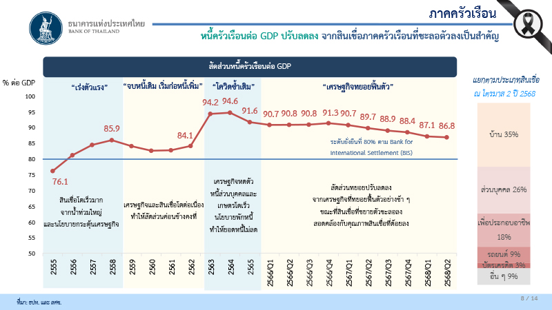 อย่างไรก็ตาม ยังต้องติดตามภาวะการเงินที่ยังตึงตัวและความสามารถในการชำระหนี้ของลูกหนี้ SMEs และครัวเรือนท่ามกลางเศรษฐกิจที่ยังชะลอลงจากผลกระทบของมาตรการภาษีสหรัฐฯ และรายได้ที่ฟื้นตัวช้า ทั้งนี้ ความช่วยเหลือภายใต้โครงการ “คุณสู้ เราช่วย” มีส่วนช่วยบรรเทาภาระหนี้ของ SMEs และครัวเรือนกลุ่มเปราะบาง โดยสัดส่วนหนี้ครัวเรือนต่อ GDP ไตรมาส 2 ปี 2568 ปรับลดลงจากไตรมาสก่อน จากสินเชื่อภาคครัวเรือนที่ขยายตัวชะลอลงเป็นสำคัญ ขณะที่ภาคธุรกิจมีสัดส่วนหนี้สินต่อ GDP ลดลงตามการก่อหนี้ที่ลดลงเป็นสำคัญ ด้านความสามารถในการทำกำไรลดลงจากระยะเดียวกันปีก่อนเกือบทุกประเภทธุรกิจ โดยเฉพาะธุรกิจอสังหาริมทรัพย์ตามภาวะตลาดที่อยู่อาศัยที่ชะลอตัว