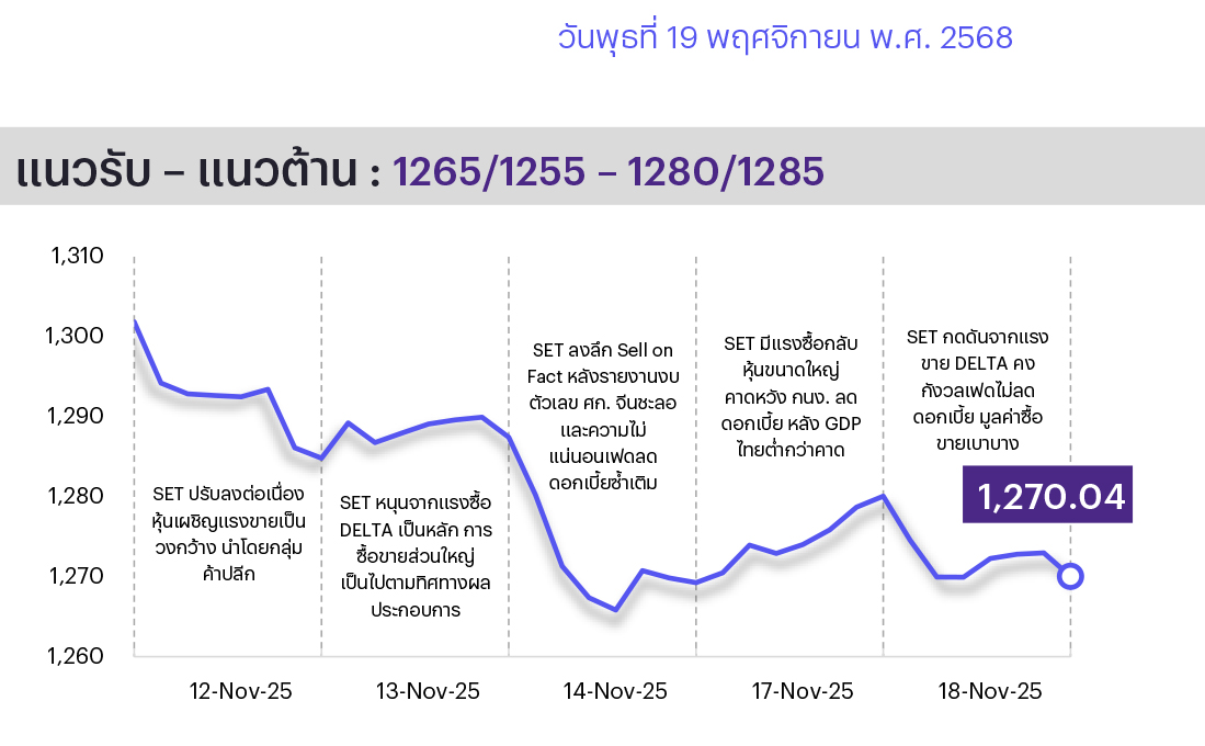คาดตลาดแกว่งตัวไซด์เวย์/รอเบรก ปัจจัยในประเทศมีปัจจัยหนุนระยะสั้นสัญญาณภาษีศุลกากรไทย-สหรัฐฯ ดีขึ้น นายกฯ ชี้ว่า ปธน. ทรัมป์พร้อมลดภาษีแลกไทยกู้ทุ่นระเบิดเป็นสัญญาณบวก แต่ปัจจัยภายนอกยังเป็นลบ ความกังวล Valuation หุ้นเทคฯ กดดันหุ้นเอเชีย ในขณะที่กรรมการเฟดหลายท่านออกมาส่งสัญญาณระมัดระวังในการลดดอกเบี้ย แต่ภาคแรงงานที่แย่ยังหนุน ทางเทคนิค แกว่งในกรอบหากหลุดต่ำกว่า 1265 จะกลับมาลงรอบใหม่ แต่หากยืนเหนือ 1280 ได้มีช่วงรีบาวด์ต่อ