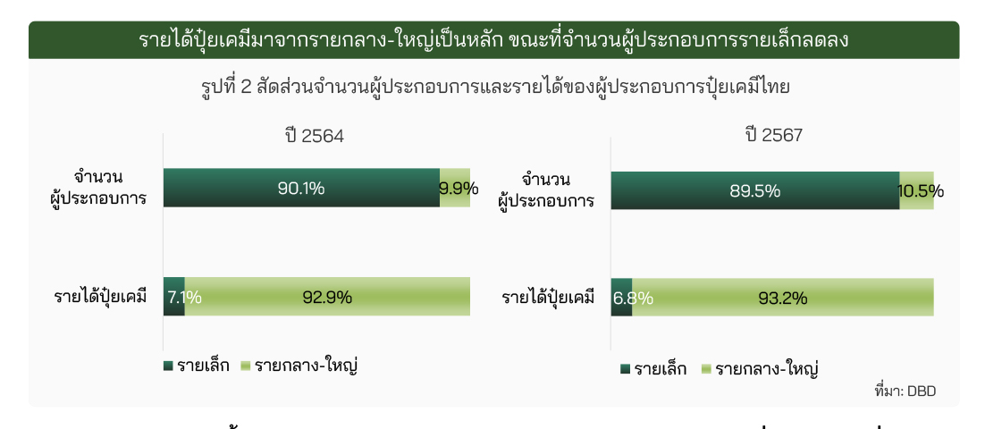 ปัจจุบันตลาดปุ๋ยเคมีแข่งขันสูงจากผู้เล่นจำนวนมากกว่า 685 ราย1 โดยส่วนใหญ่เป็นผู้เล่นรายเล็ก ซึ่งจะแข่งขันได้ยาก เนื่องจากมีการผลิตปุ๋ยเคมีที่คุณภาพไม่สม่ำเสมอ จึงเป็นข้อจำกัดในการเพิ่มกำลังการผลิต ส่งผลต่อสัดส่วนจำนวนผู้เล่นลดลงจาก 90.1% ในปี 2564 เป็น 89.5% ในปี 2567 และยังสร้างสัดส่วนรายได้เพียง 7% ของรายได้ปุ๋ยเคมีทั้งหมด ขณะที่ผู้เล่นรายกลาง-ใหญ่จะได้เปรียบด้านต้นทุนการผลิตที่ต่ำกว่า ความหลากหลายของผลิตภัณฑ์ และยังมีกลยุทธ์ส่งเสริมการขายต่อเนื่อง จึงสามารถจำหน่ายปุ๋ยเคมีได้ตลอดทั้งปี ทำให้แม้จะมีสัดส่วนจำนวนผู้เล่นเพียง 10% แต่กลับมีสัดส่วนรายได้ถึง 93% ของรายได้ปุ๋ยเคมีทั้งหมด (รูปที่ 2)