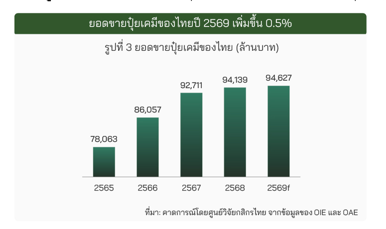 · ในปี 2569 ยอดขายปุ๋ยเคมีของไทย คาดว่าจะอยู่ที่ 94,627 ล้านบาท หรือโต 0.5% ชะลอลงจากปี 2568 ที่โต 1.5% ตามความต้องการใช้ปุ๋ยเคมีที่เพิ่มขึ้นไม่มาก และราคาขายปุ๋ยเคมีในประเทศที่ปรับลดลง ซึ่งเป็นไปตามแนวโน้มราคาปุ๋ยเคมีในตลาดโลก