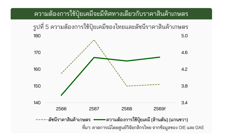 สำหรับปัจจัยสำคัญที่หนุนความต้องการใช้ปุ๋ยเคมีของไทยในปี 2569 คือ ราคาสินค้าเกษตรในรายการสำคัญที่น่าจะขยับขึ้นได้เล็กน้อย จะจูงใจให้เกษตรกรมีความต้องการใช้ปุ๋ยเคมีมากขึ้น เพื่อเพิ่มผลผลิต ทั้งนี้ ความต้องการใช้ปุ๋ยเคมีจะมีความสัมพันธ์ไปในทิศทางเดียวกับราคาสินค้าเกษตร (รูปที่ 5)