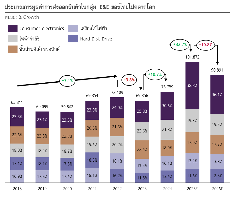 มูลค่าการส่งออกของอุตสาหกรรมอิเล็กทรอนิกส์ของไทยในปี 2569 มีแนวโน้มกลับมาหดตัว -10.8%YOY ตามทิศทางเศรษฐกิจโลก การแข่งขันที่สูงขึ้นและผลกระทบจากมาตรการภาษีสหรัฐฯ เมื่อเทียบกับในปี 2568 ที่คาดว่าจะขยายตัว จากอานิสงส์ระยะสั้นของการเร่งนำเข้าของสหรัฐฯ