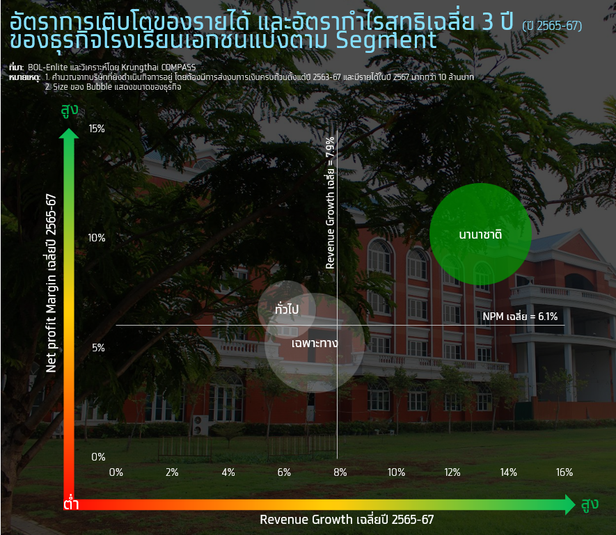 Krungthai COMPASS แบ่งธุรกิจโรงเรียนเอกชนออกเป็น 3 Segments ได้แก่ โรงเรียนทั่วไป, โรงเรียนนานาชาติ และโรงเรียนเฉพาะทาง โดย 3 ปีหลังสุด (ปี 2565-67) Segment ที่มีผลดำเนินงานโดดเด่นคือ “โรงเรียนนานาชาติ” สะท้อนจากการมี Revenue Growth เฉลี่ยถึงปีละ 13.0% และมี Net Profit Margin เฉลี่ย 10.2% สูงกว่าธุรกิจโรงเรียนเอกชนโดยรวมที่ 7.9% และ 6.1% ตามลำดับ