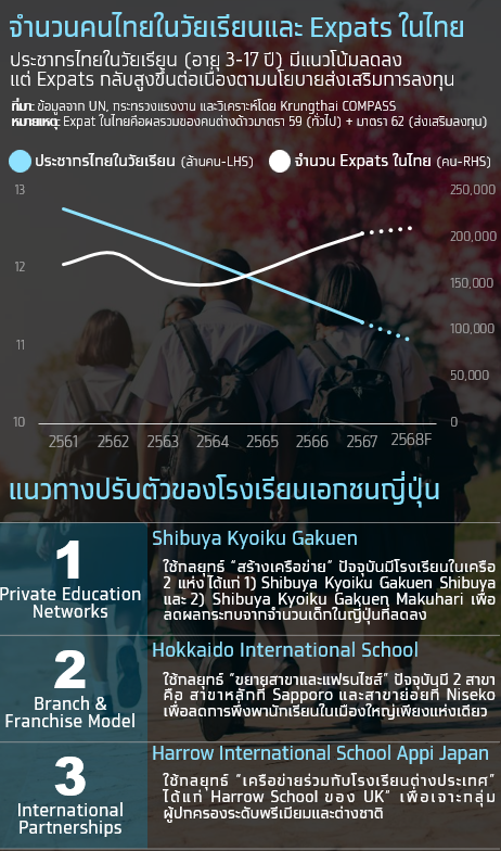 ธุรกิจโรงเรียนเอกชนญี่ปุ่นซึ่งเผชิญภาวะ Aging Population มาก่อนไทยได้เลือกใช้กลยุทธ์ “การสร้างเครือข่ายกับโรงเรียนต่างชาติ” และ “การขยายสาขา” เพื่อลดผลกระทบจากจำนวนเด็กที่ลดลง อาทิ Harrow International School Appi Japan ได้เข้าเป็นเครือข่ายอย่างเป็นทางการของ Harrow School (UK) เพื่อจับกลุ่มลูกค้าที่มีกำลังซื้อสูง โดยเฉพาะครอบครัวต่างชาติ ซึ่งถือเป็นกลยุทธ์ที่สามารถประยุกต์ใช้ได้ในไทยเช่นเดียวกัน เนื่องจากนโยบายส่งเสริมการลงทุนของรัฐบาลไทยในช่วงหลายปีที่ผ่านมานั้นทำให้มีจำนวน Expats เพิ่มขึ้นต่อเนื่อง หรือ Hokkaido International School เริ่มแรกมีสาขาหลักที่เมือง Sapporo แต่ในปี 2555 ทางโรงเรียนได้มีการขยายสาขาย่อยที่เมือง Niseko เพื่อลดการพึ่งพานักเรียนในเมืองใหญ่เพียงแห่งเดียว